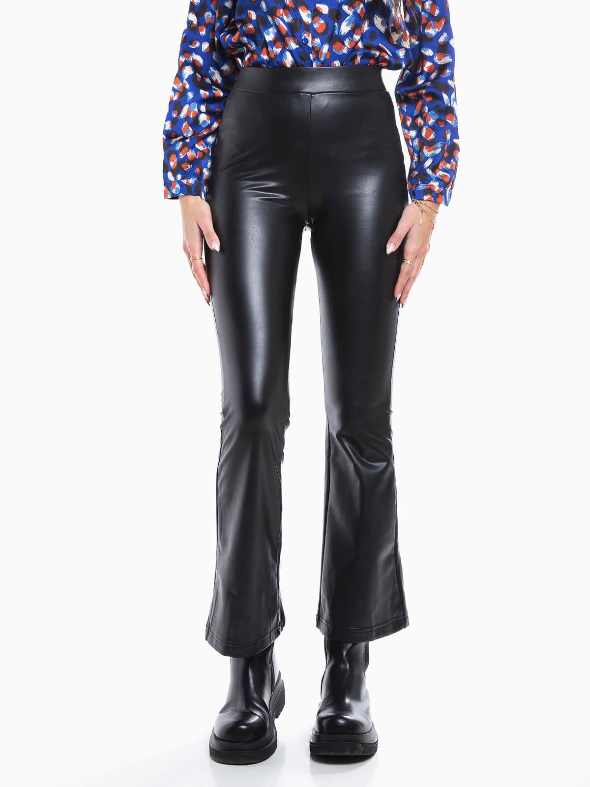 Leggings pretas polipele à boca de sino. Leggings de cintura alta com interior cardado.