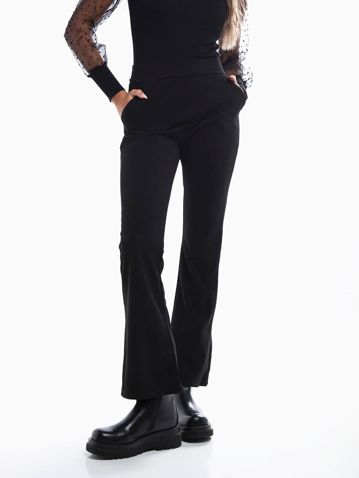 Leggings pretos à boca de sino para senhora. Leggings elásticos de cintura alta com 2 bolsos.