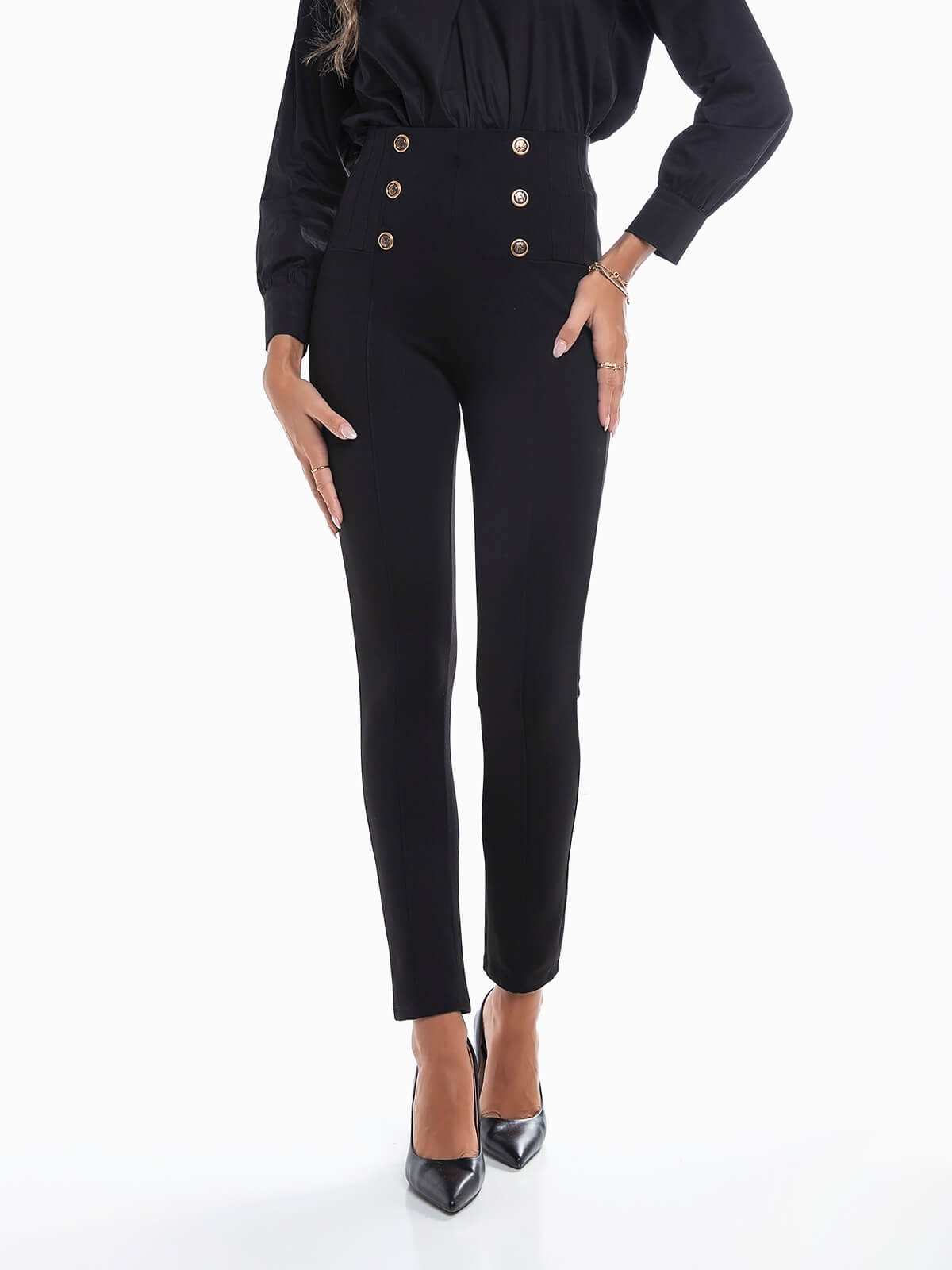 Leggings pretos com 6 botões decorativos. Leggings de cintura alta elástica para senhora.