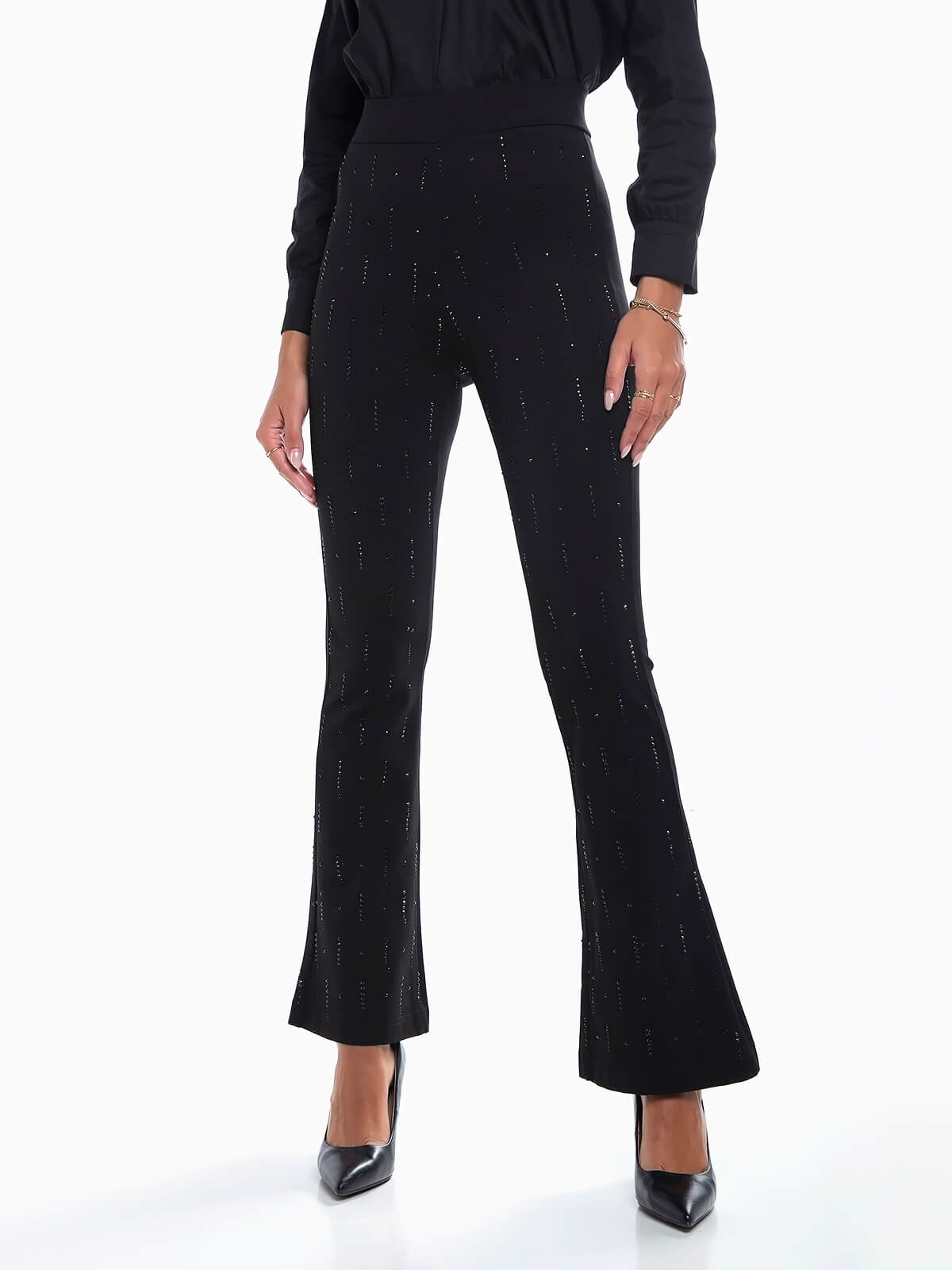 Leggings pretos à boca de sino com aplicações brilhantes. Leggings elásticos de cintura alta.
