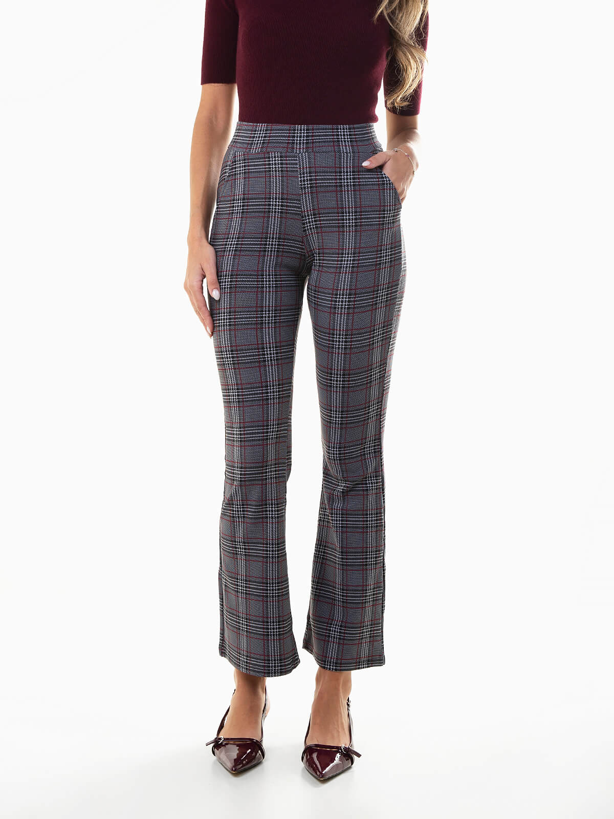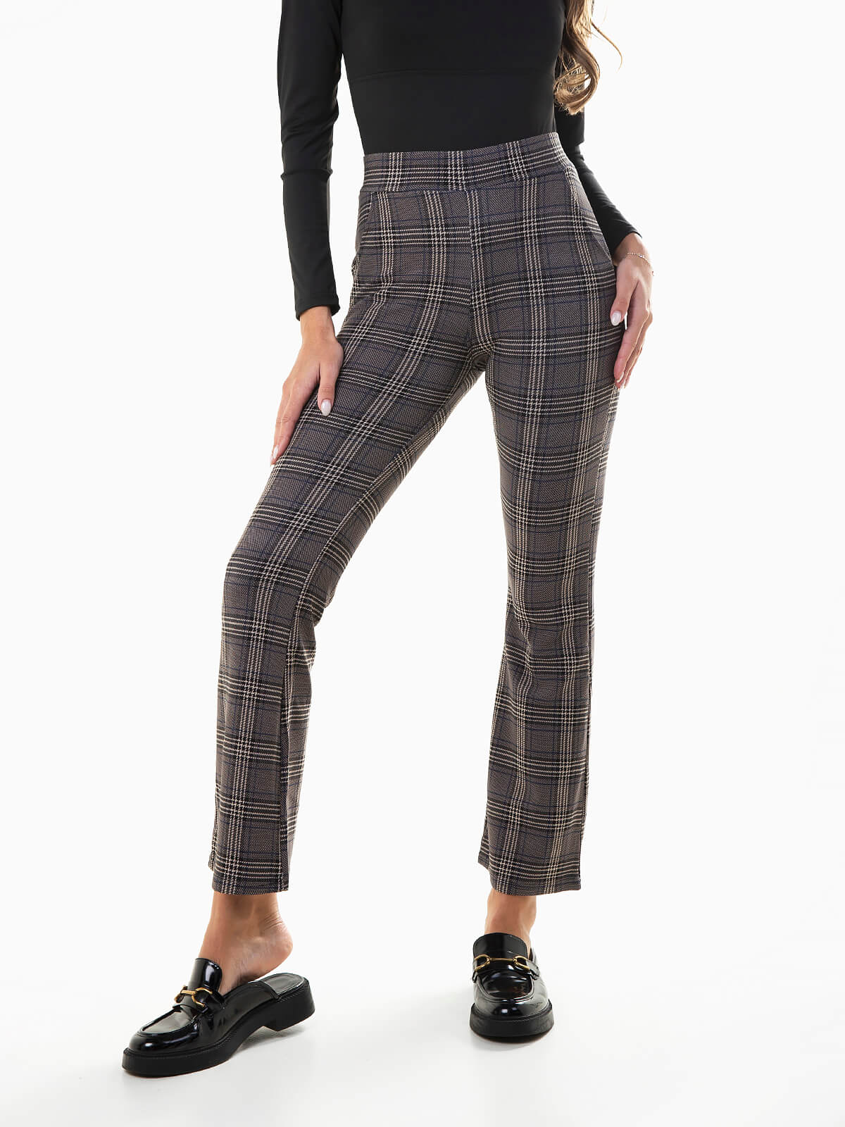 Leggings em xadrez pied-de-poule à boca de sino para senhora. Leggings elásticos de cintura alta. 2 bolsos.