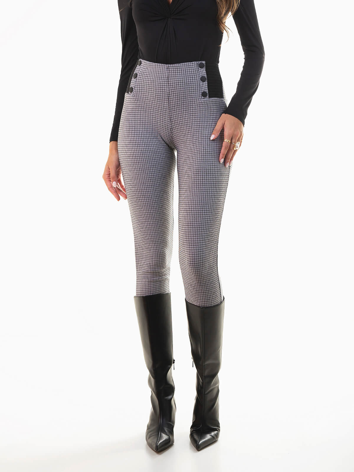 Leggings femininas em padrão xadrez, com cintura alta e cós elástico para máximo conforto. O modelo apresenta botões aplicados na frente e dois bolsos na parte posterior, combinando praticidade e estilo. Combina com uma camisa branca clássica ou uma camisola oversized para um look moderno e descontraído.