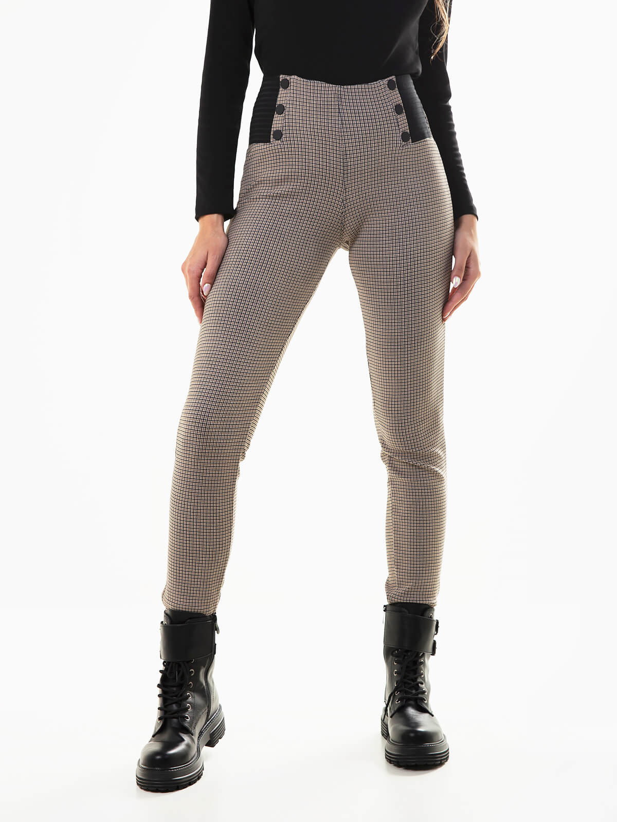 Leggings em xadrez de cintura alta para senhora. Leggings com elástico e botões aplicados à frente. 2 bolsos na parte posterior.
