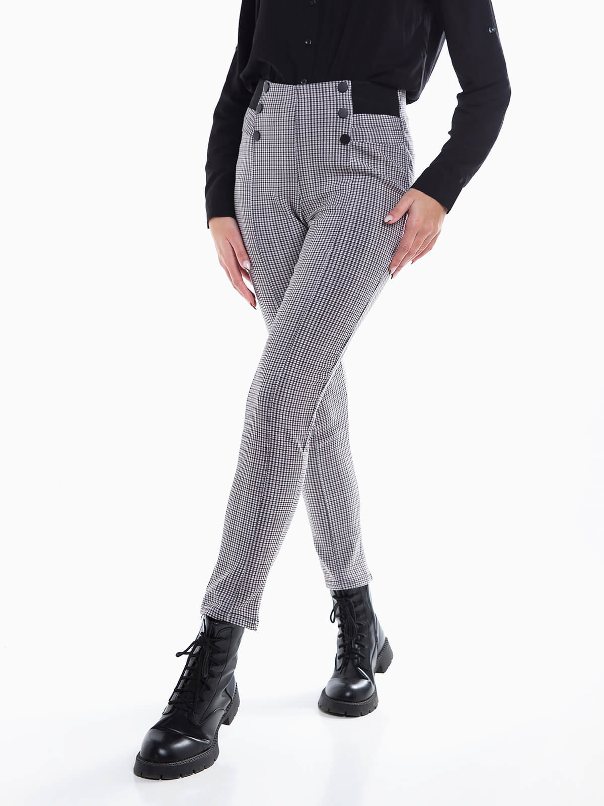 Leggings em xadrez com botões decorativos para senhora. Leggings cintura alta elástica.
