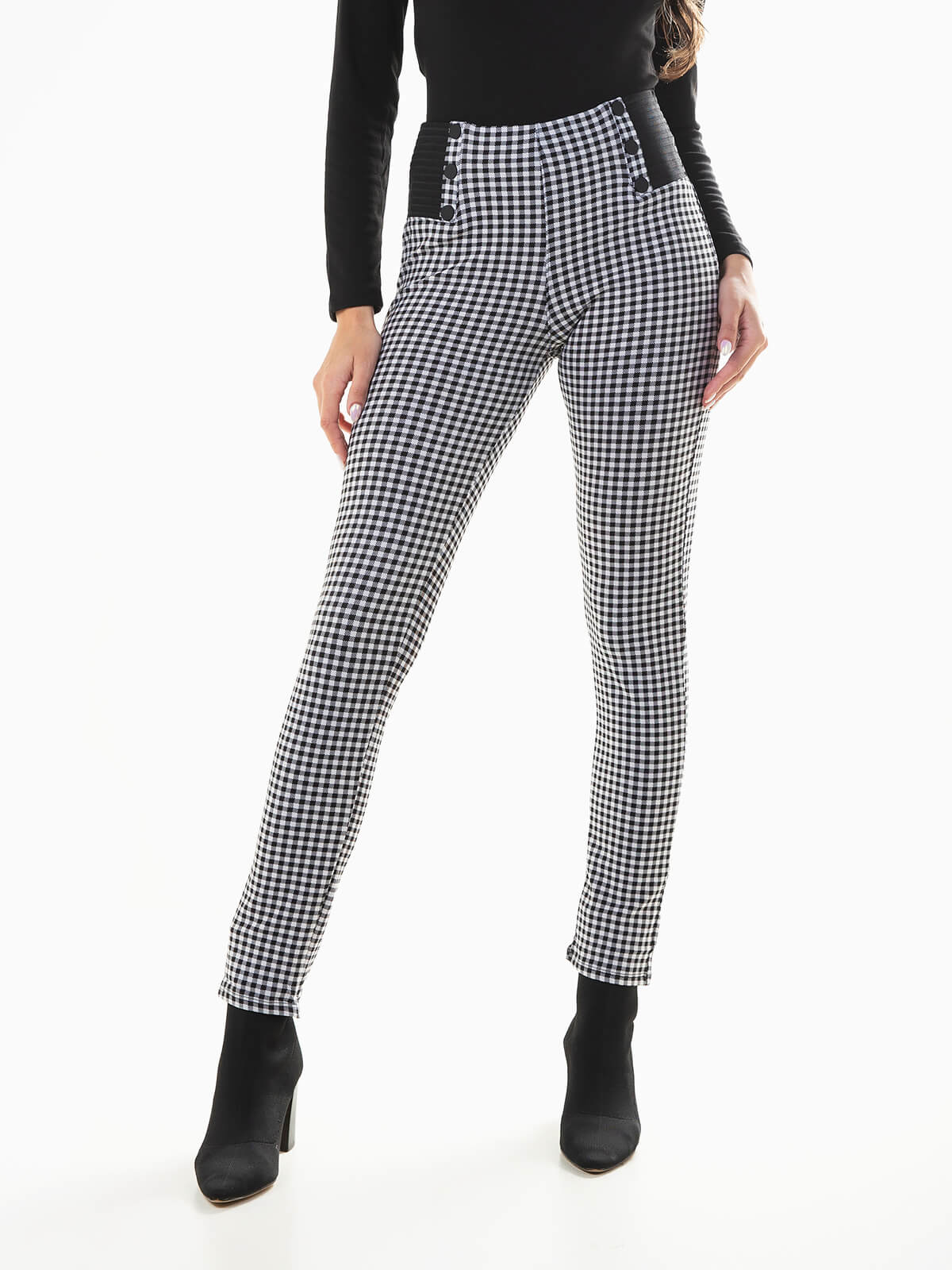 Leggings xadrez vichy de cintura alta para senhora. Leggings elásticos com botões pretos aplicados.