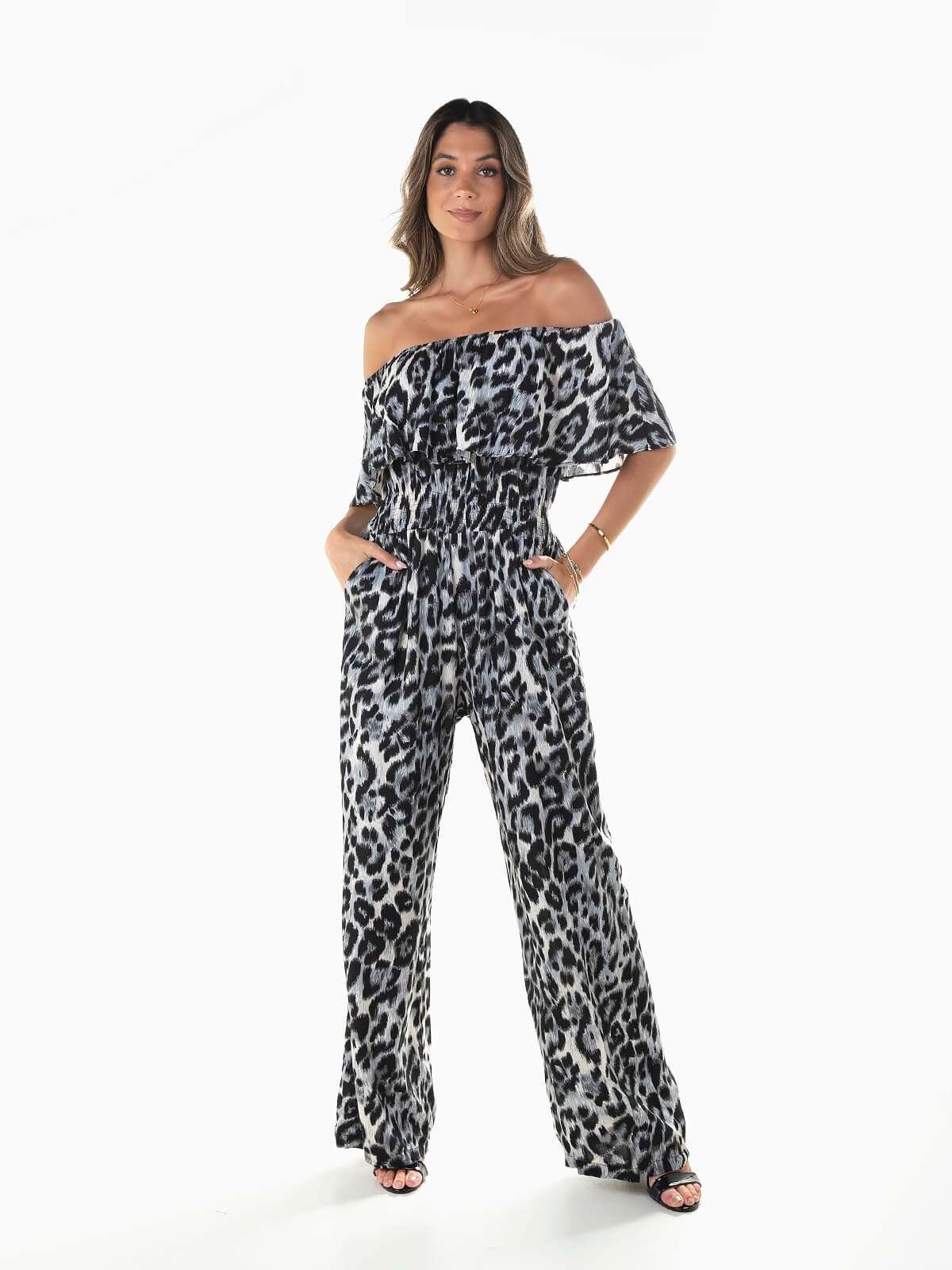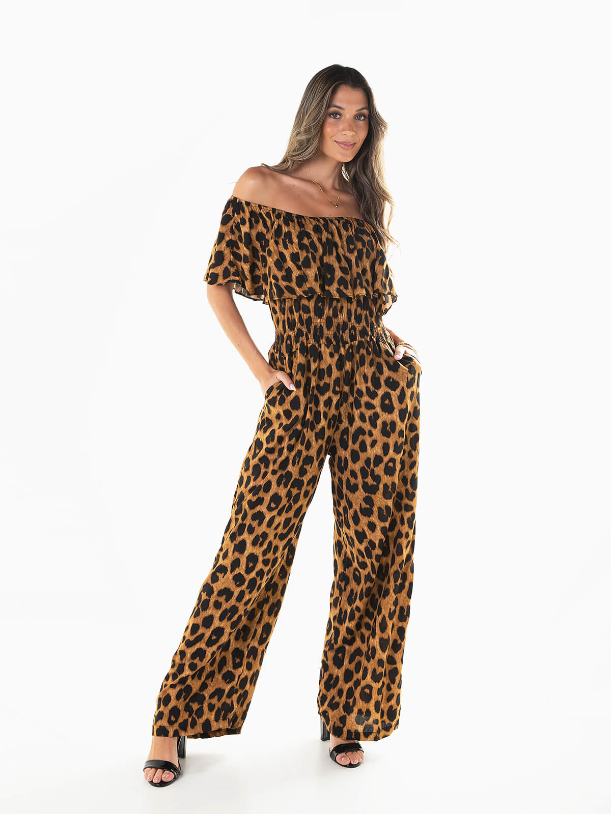 Macacão estampado leopardo com ombros descobertos e encaixe de folho. Macacão comprido em tecido fresco e fluído com pormenor franzido na cintura. Decote barco. 2 bolsos.
