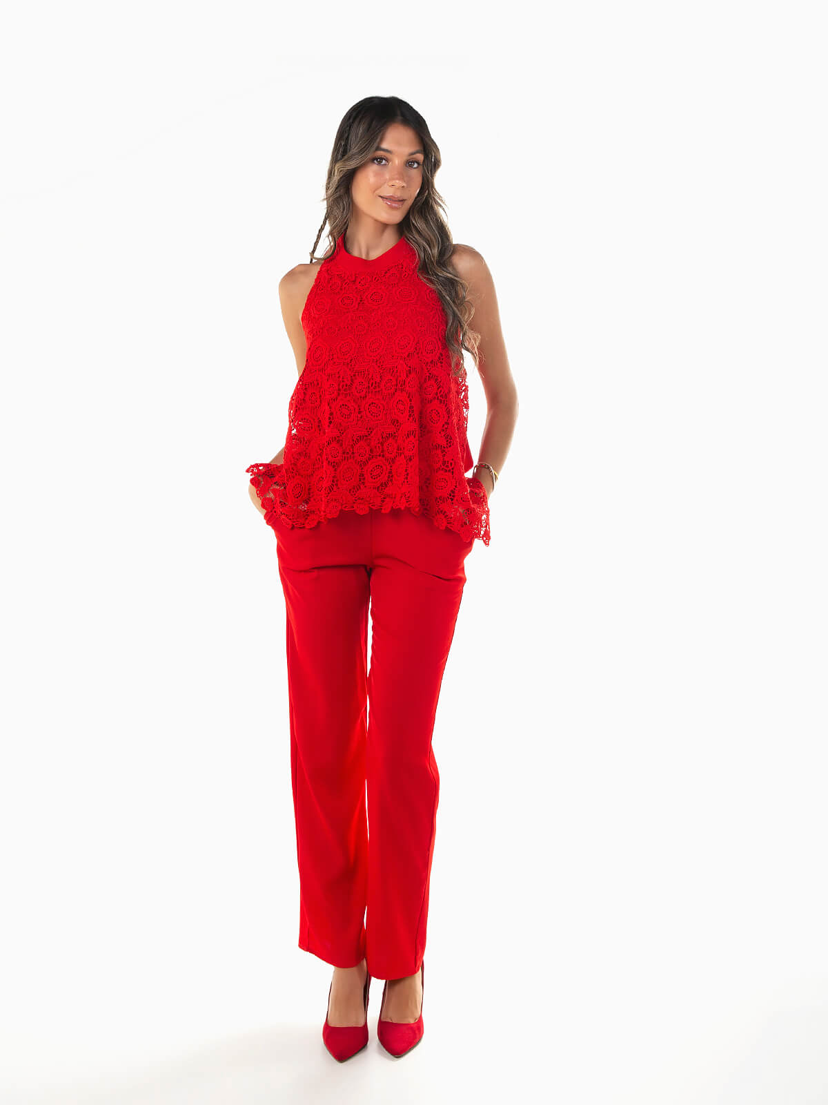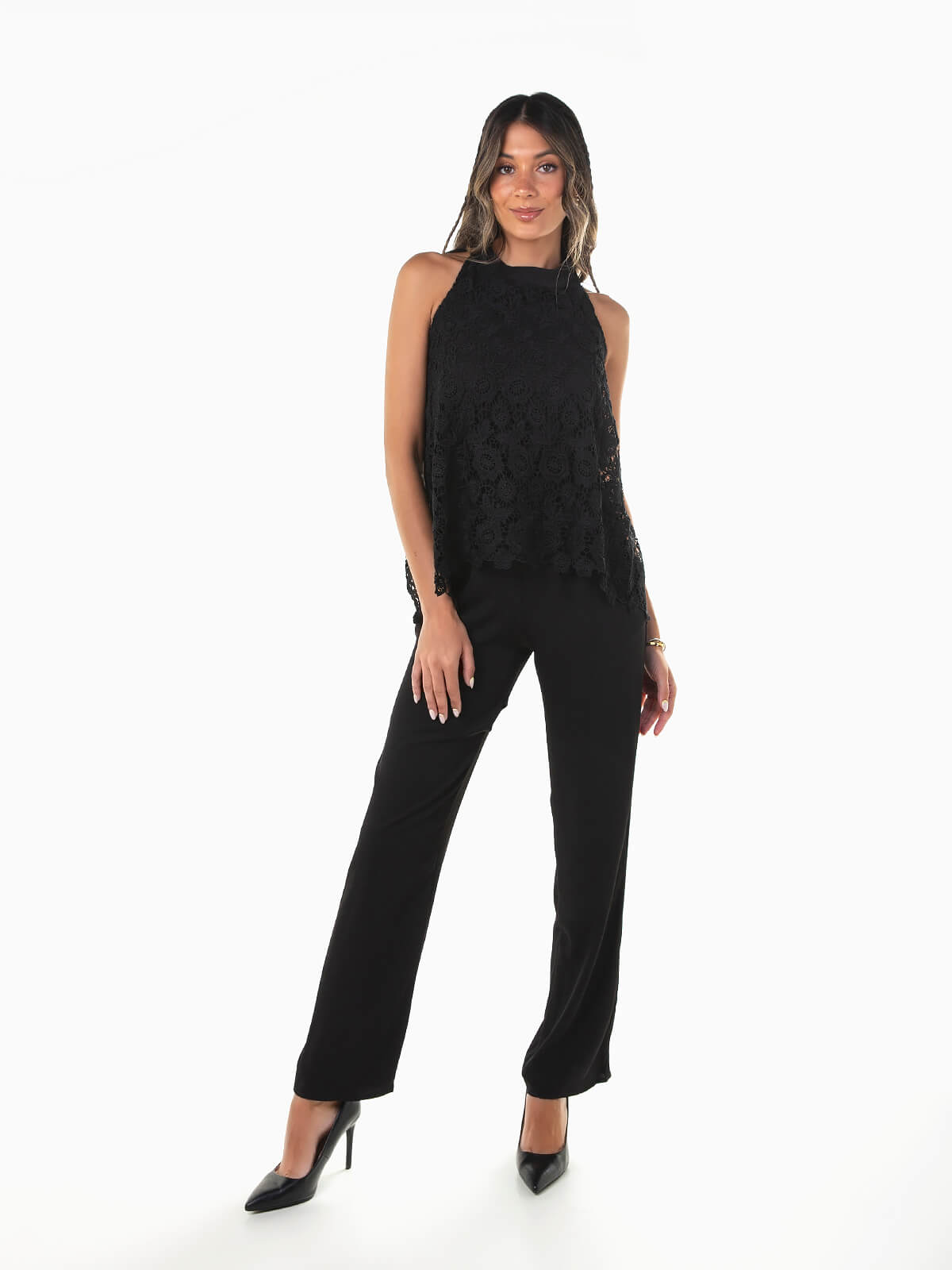 Macacão comprido combinado com parte superior em crochet. Macacão com decote halter, costas abertas e aperto de laço. Tecido clássico e interior forrado. Cintura elástica e 2 bolsos.