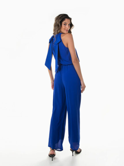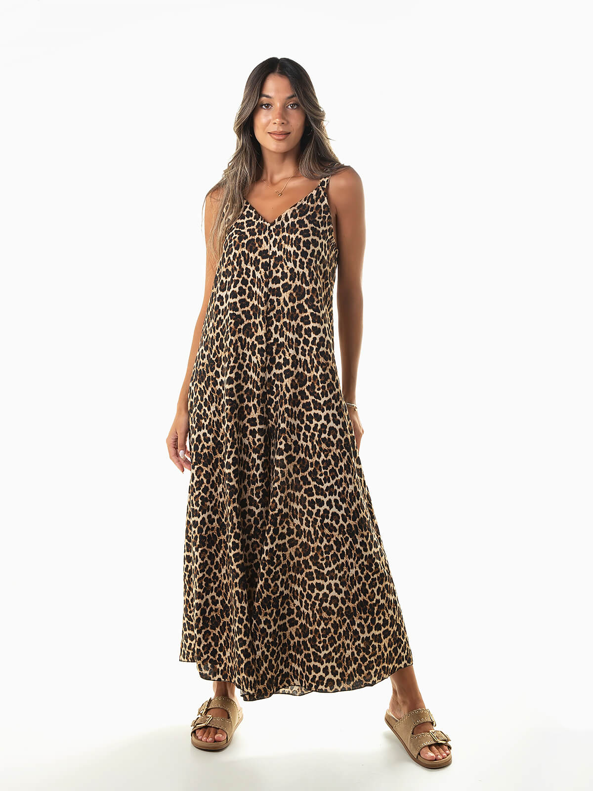 Macacão bege comprido e fluído com estampado leopardo. Macacão pantalona de alças com decote em bico.