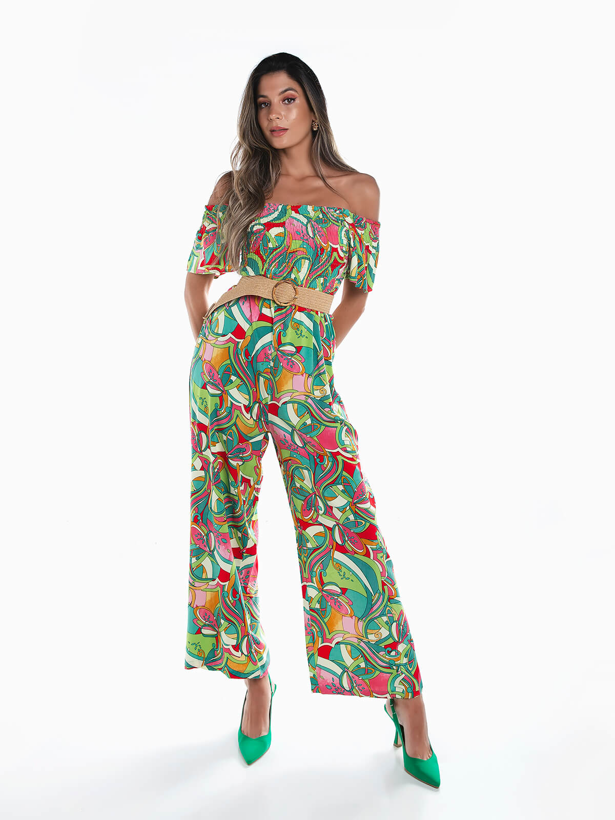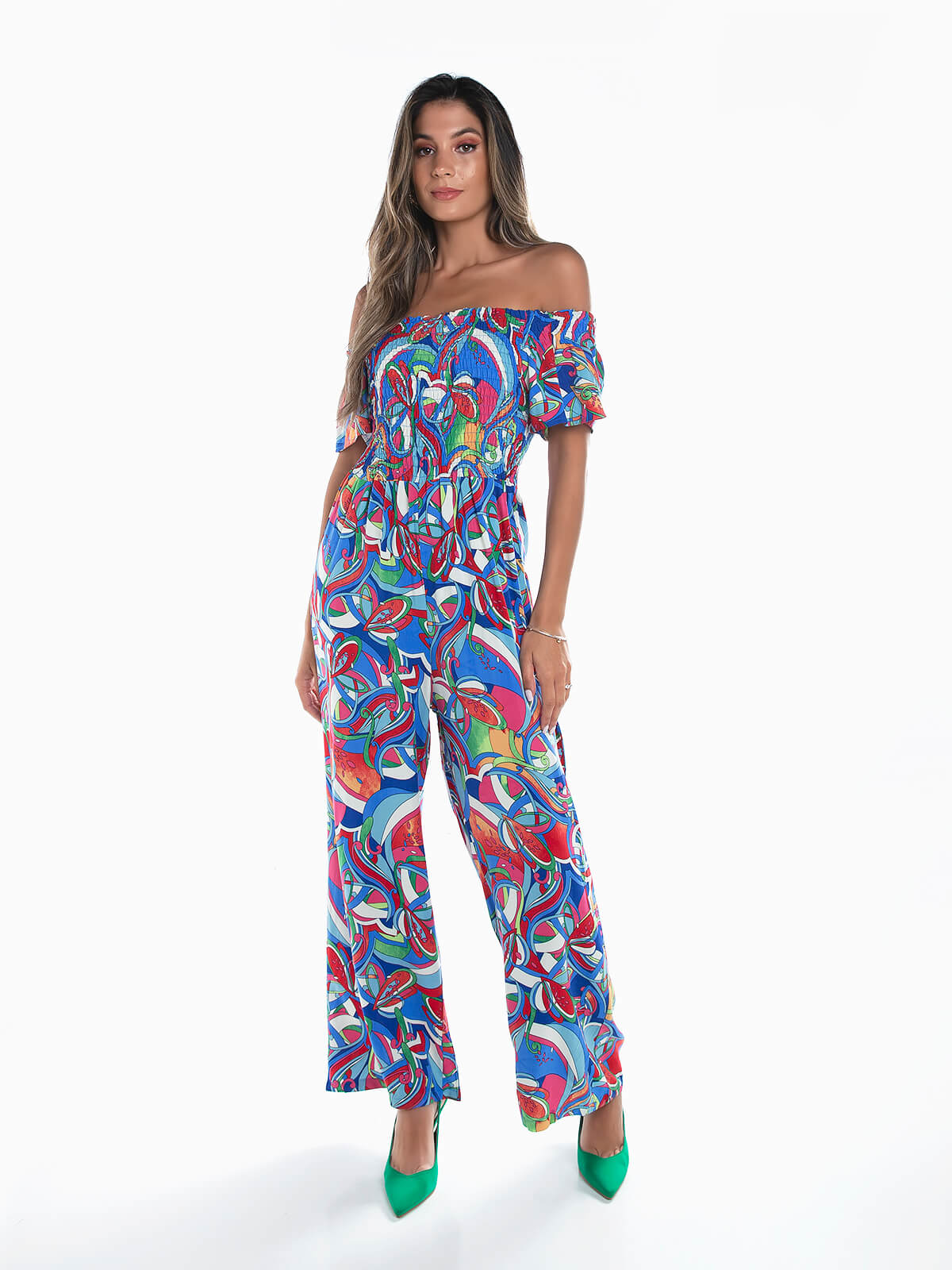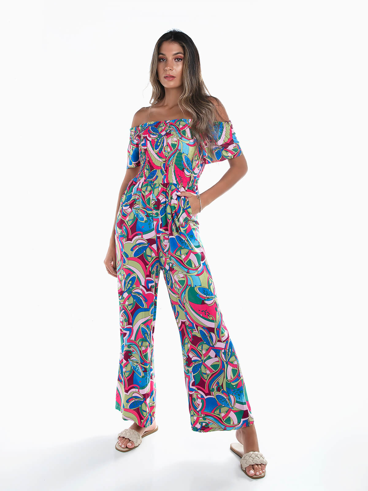 Macacão comprido com franzido smock no peito. Macacão fluído estampado com decote barco e manga curta. 2 bolsos.