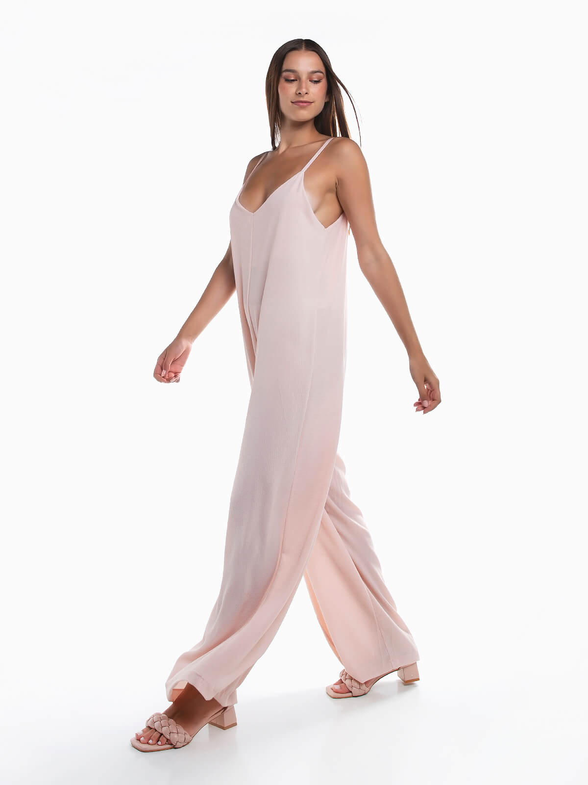 Macacão comprido largo com decote em bico à frente e atrás. Macacão em tecido com textura com alças finas reguláveis.
