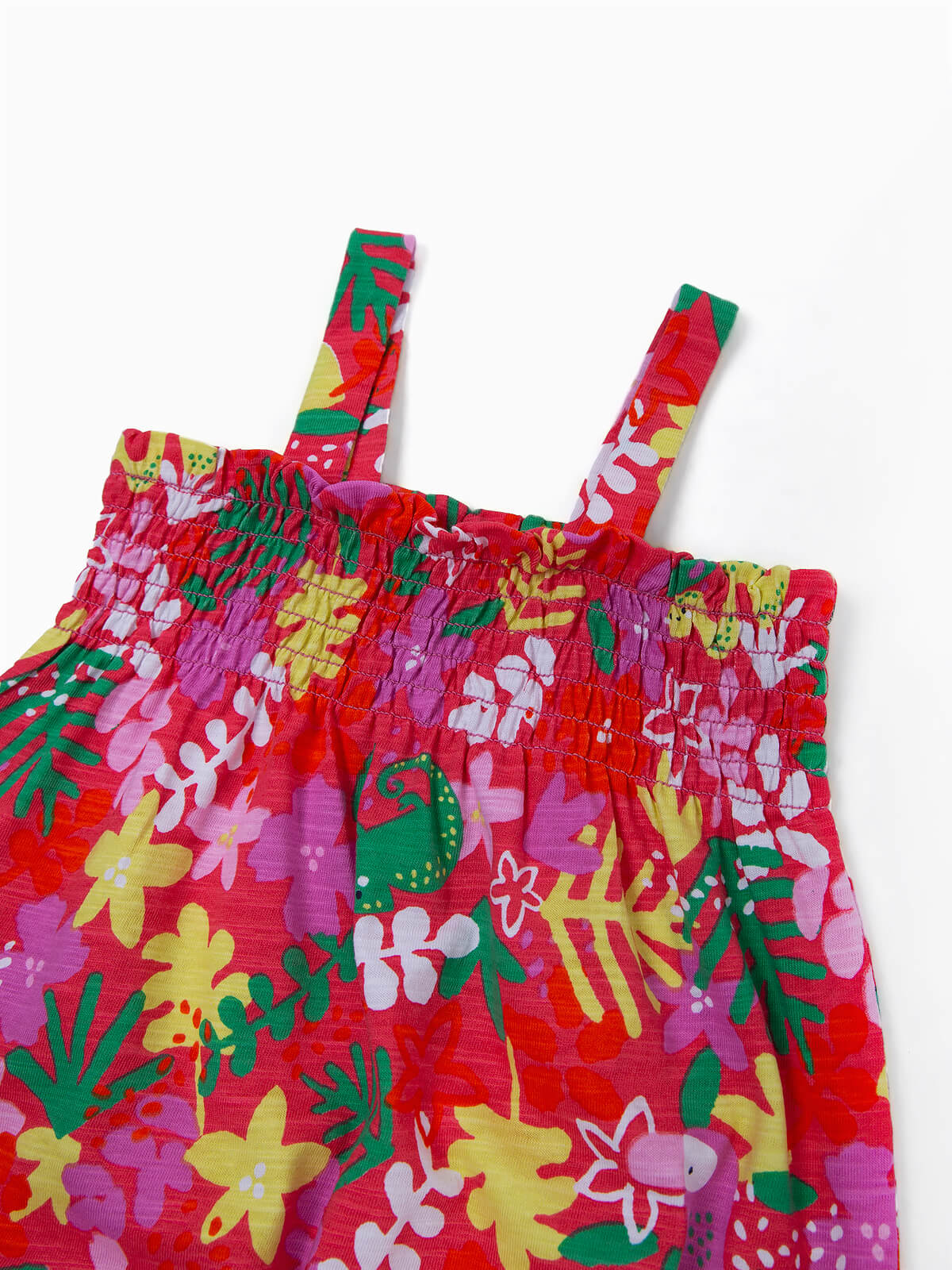 Macacão curto coral com estampado de flores e animais. Macacão de alças com peito em franzido smock. Aperto de botões de pressão na base.