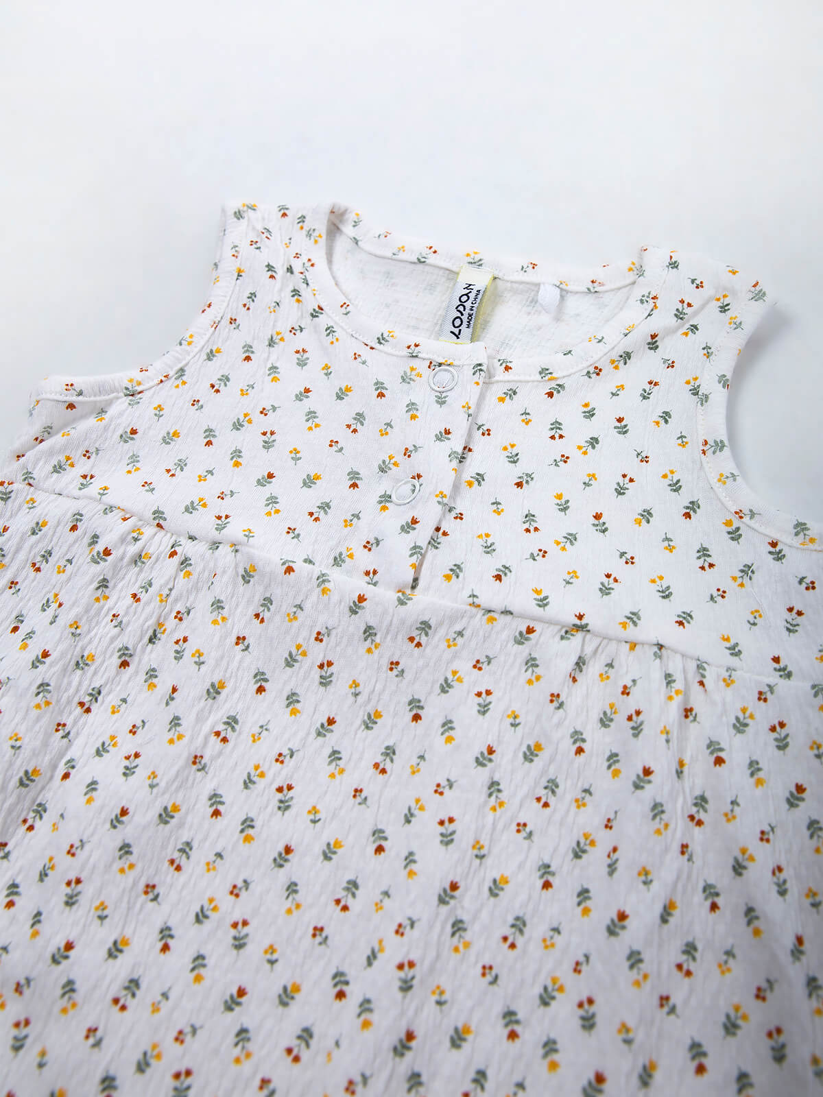 Macacão curto pérola estampado às flores para bebé menina. Macacão sem mangas 100% algodão com decote redondo. Aperto de botões de pressão.