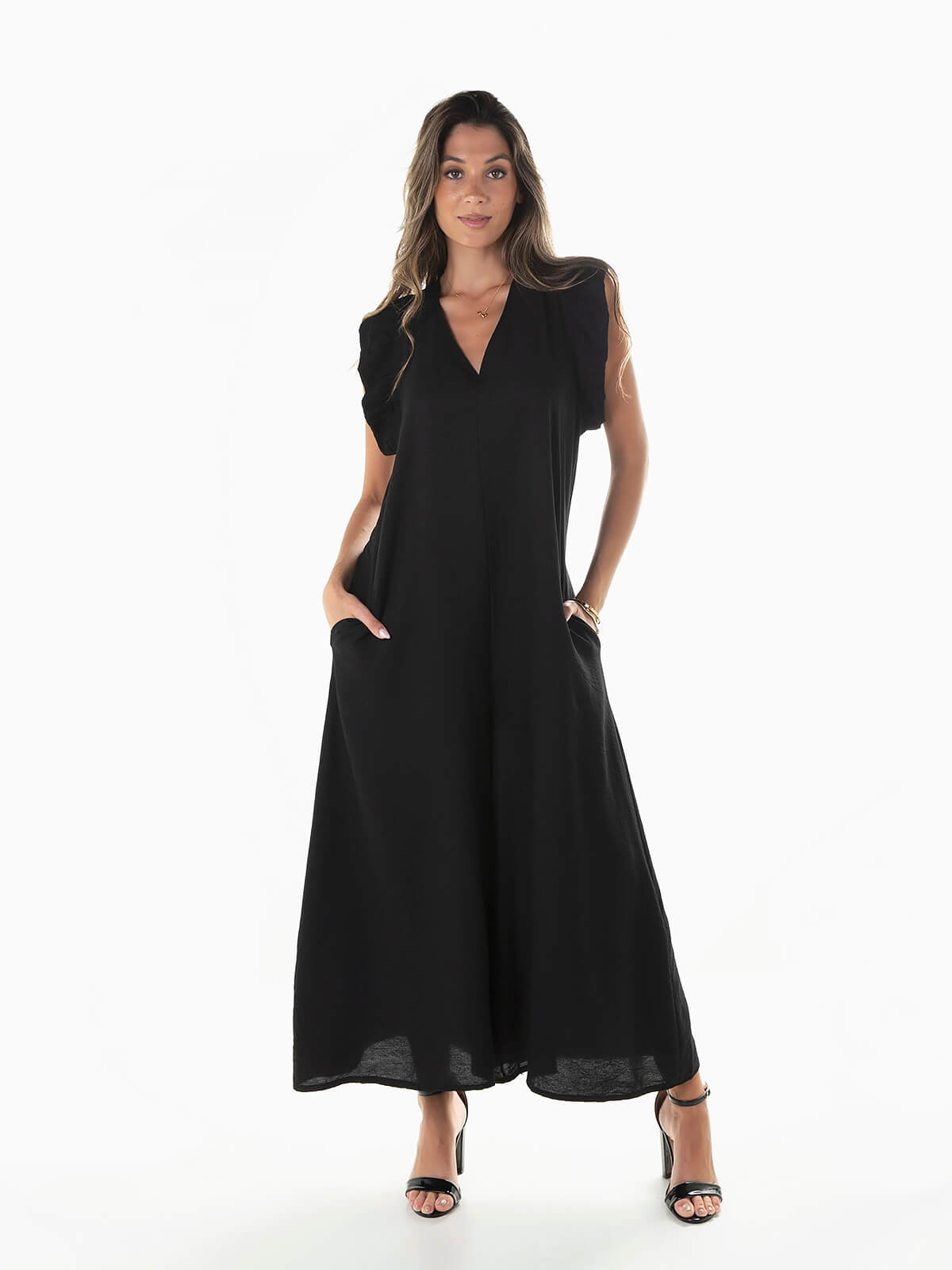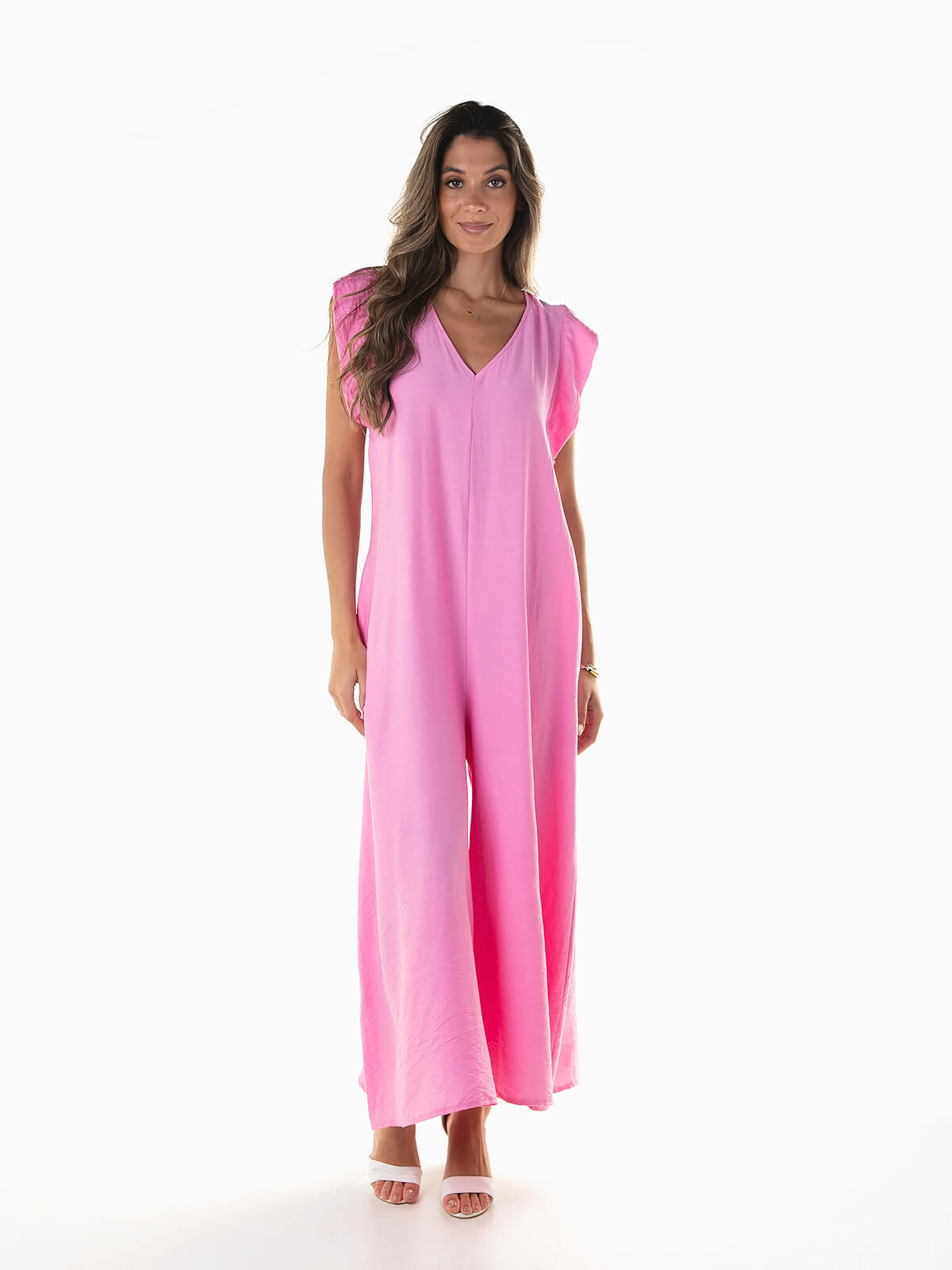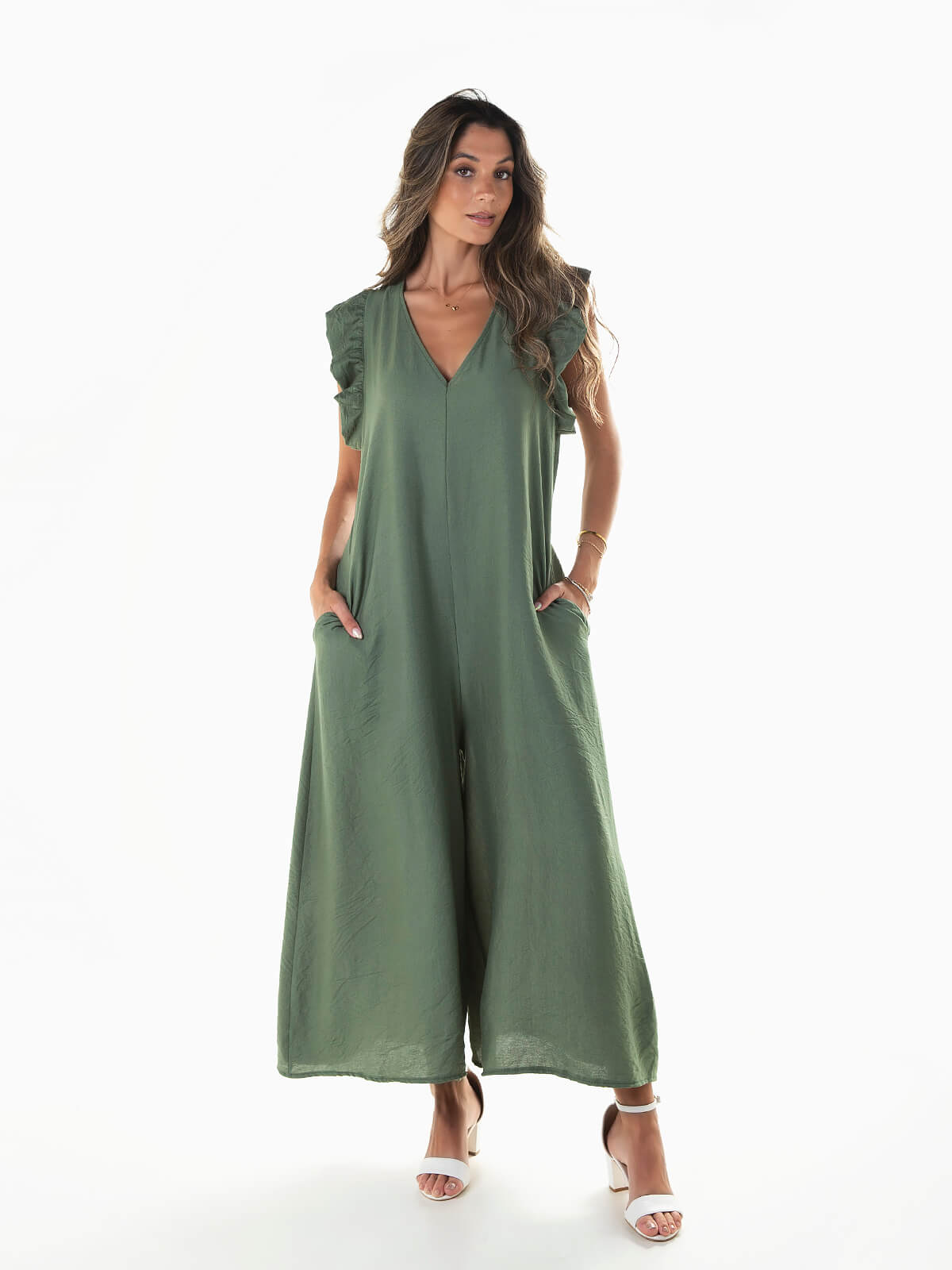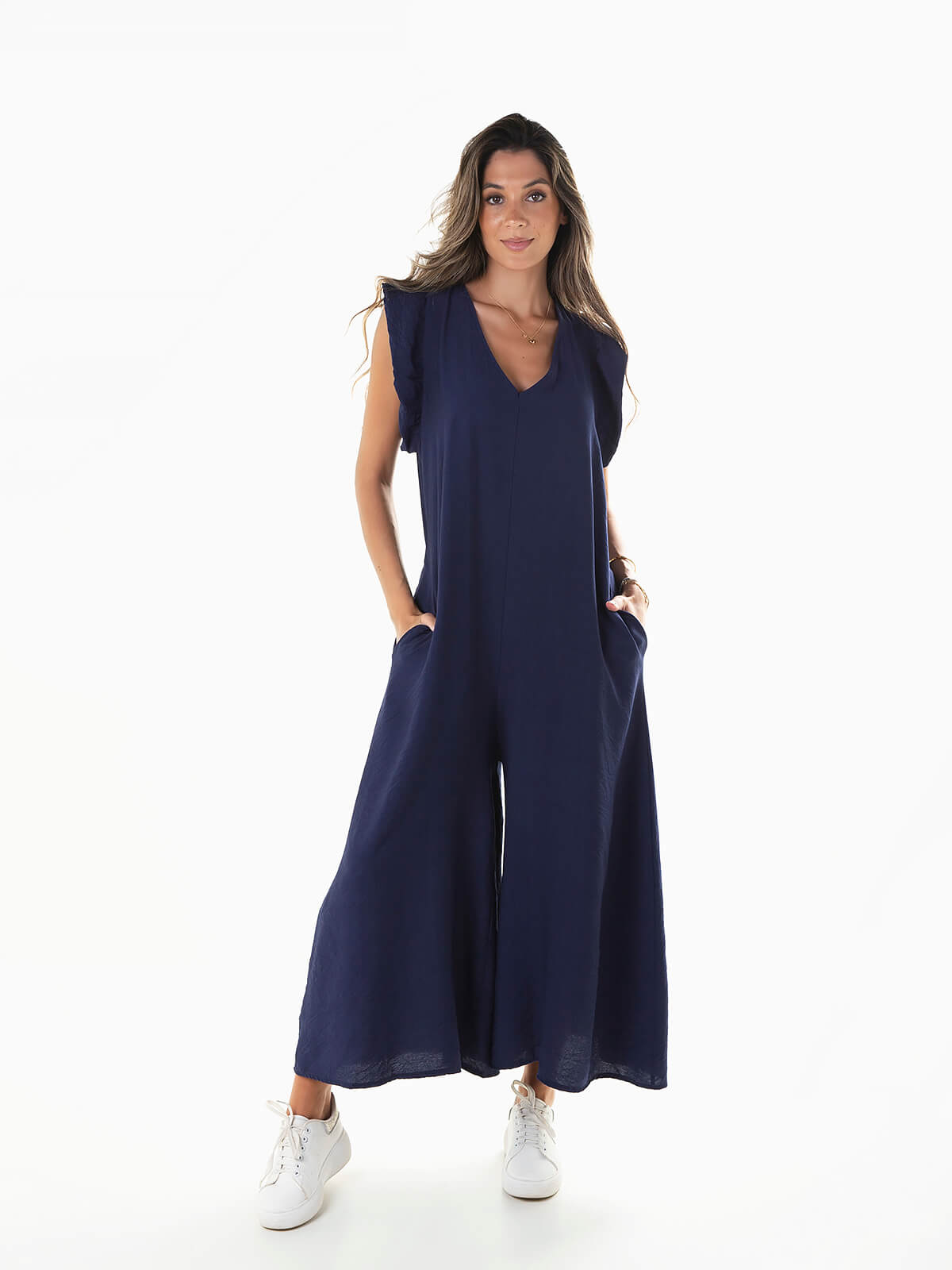 Macacão fluído com folho aplicado na cava. Macacão comprido com decote em V à frente e atrás. Cordão para ajustar. 2 bolsos.