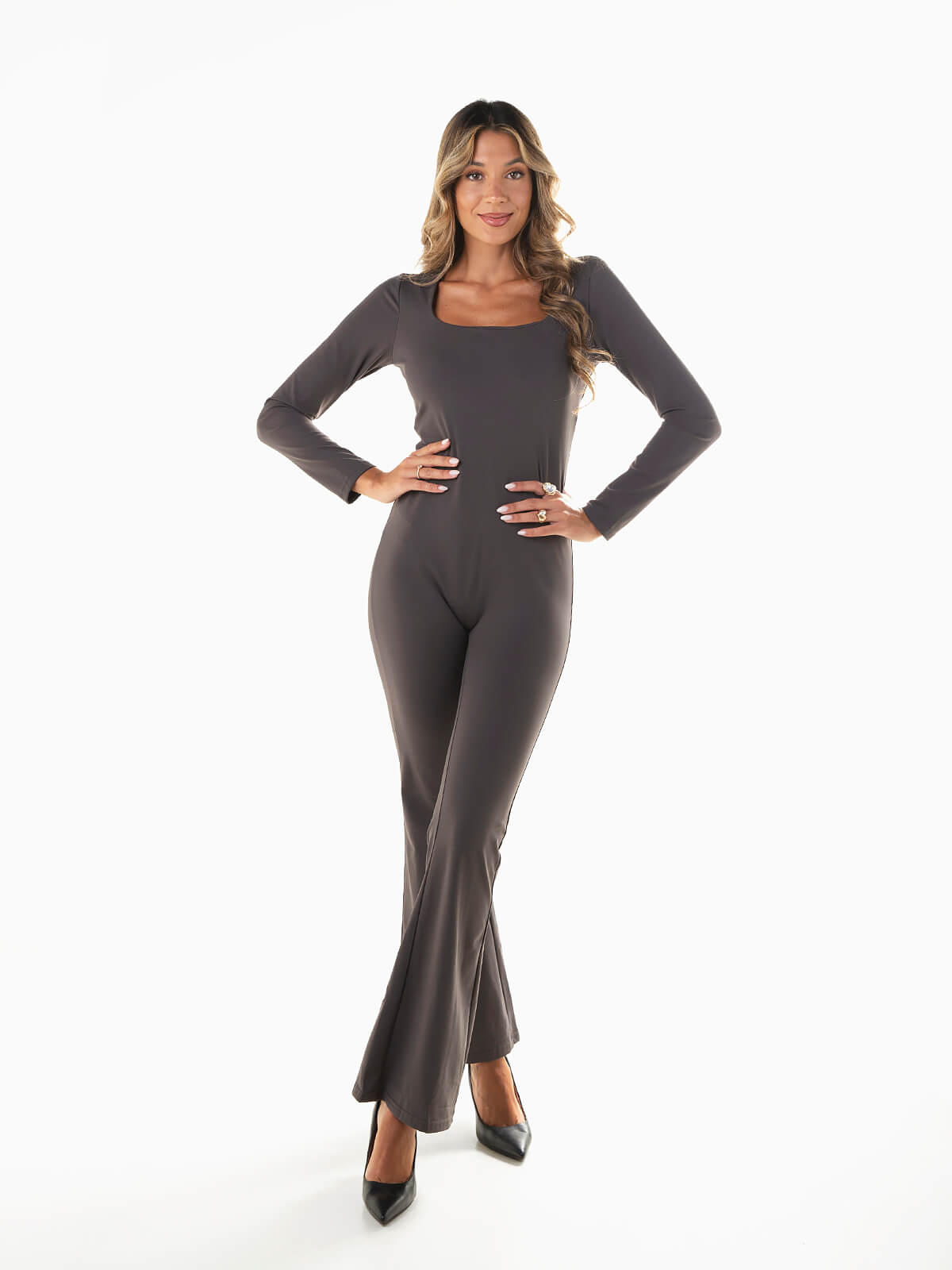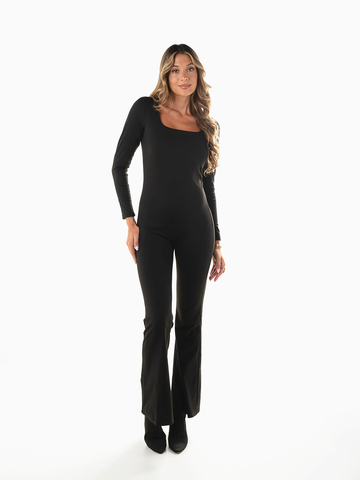 Macacão comprido em tecido elástico tipo lycra, com decote quadrado e calças em boca de sino. Modelo justo de manga comprida que valoriza a silhueta e garante conforto, ideal para looks modernos e sofisticados.