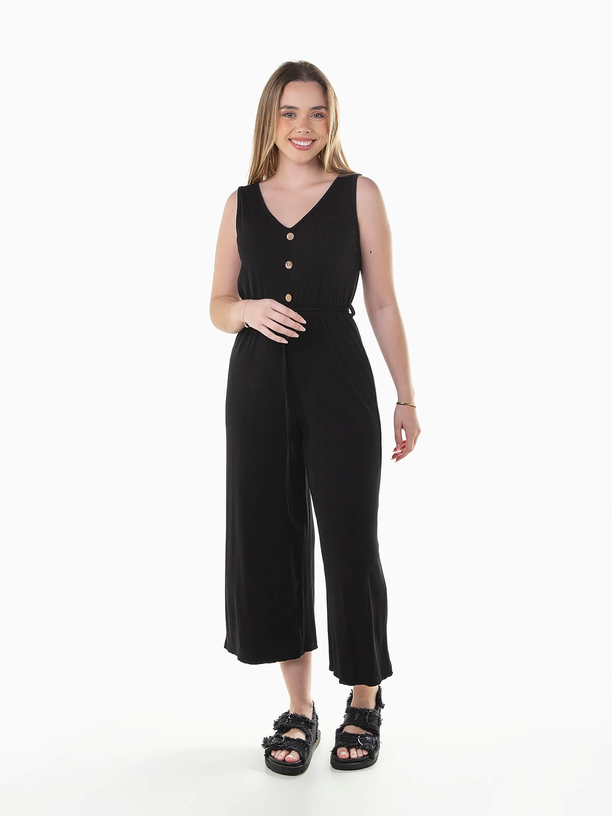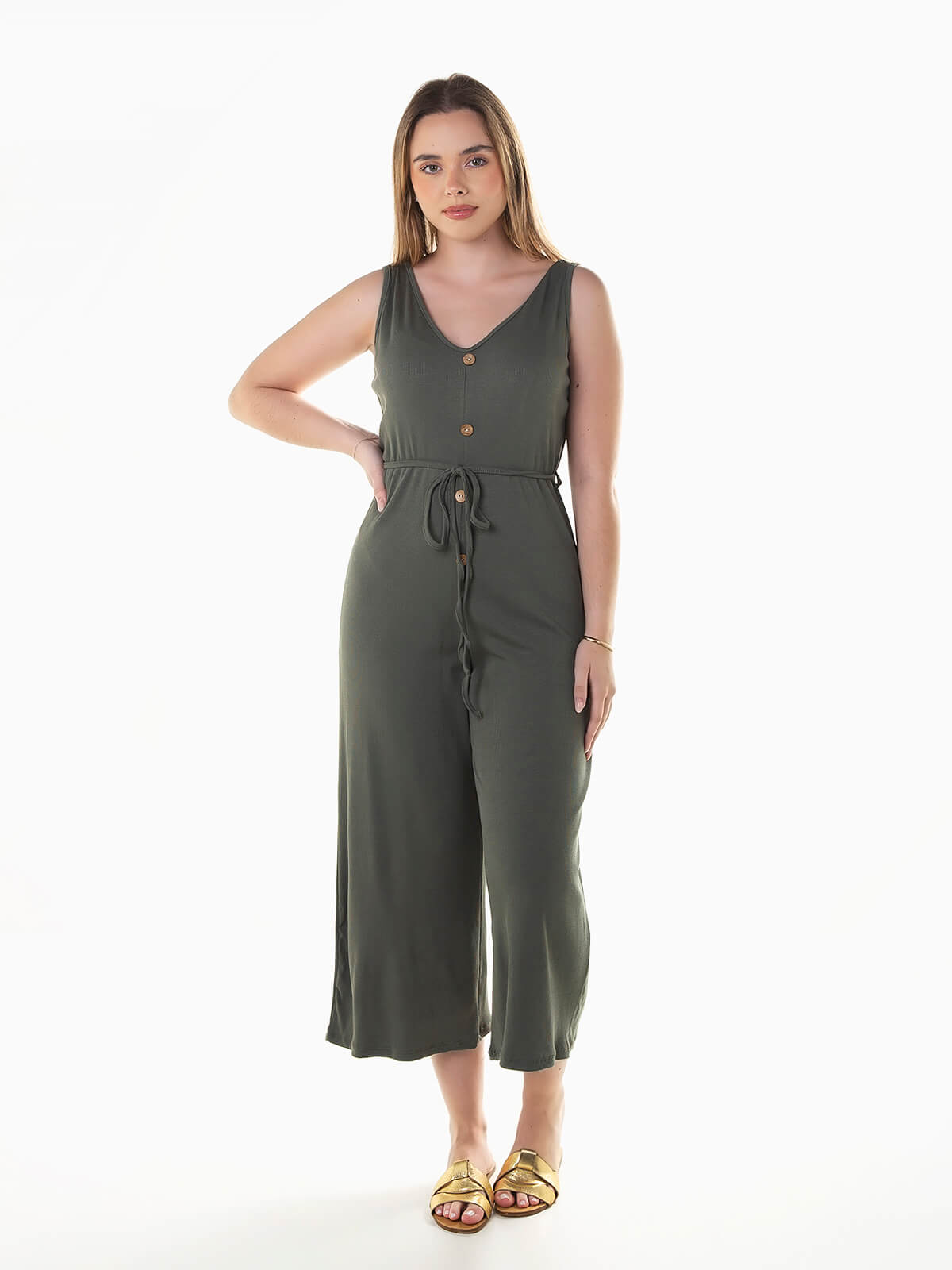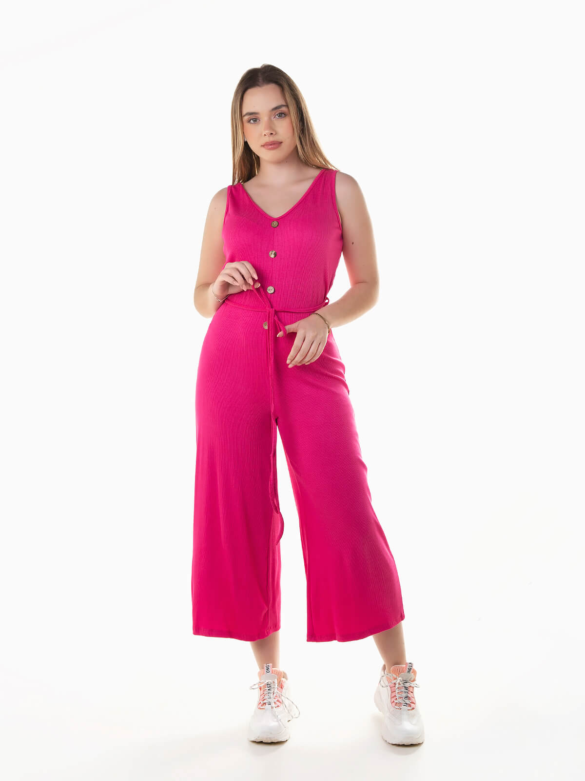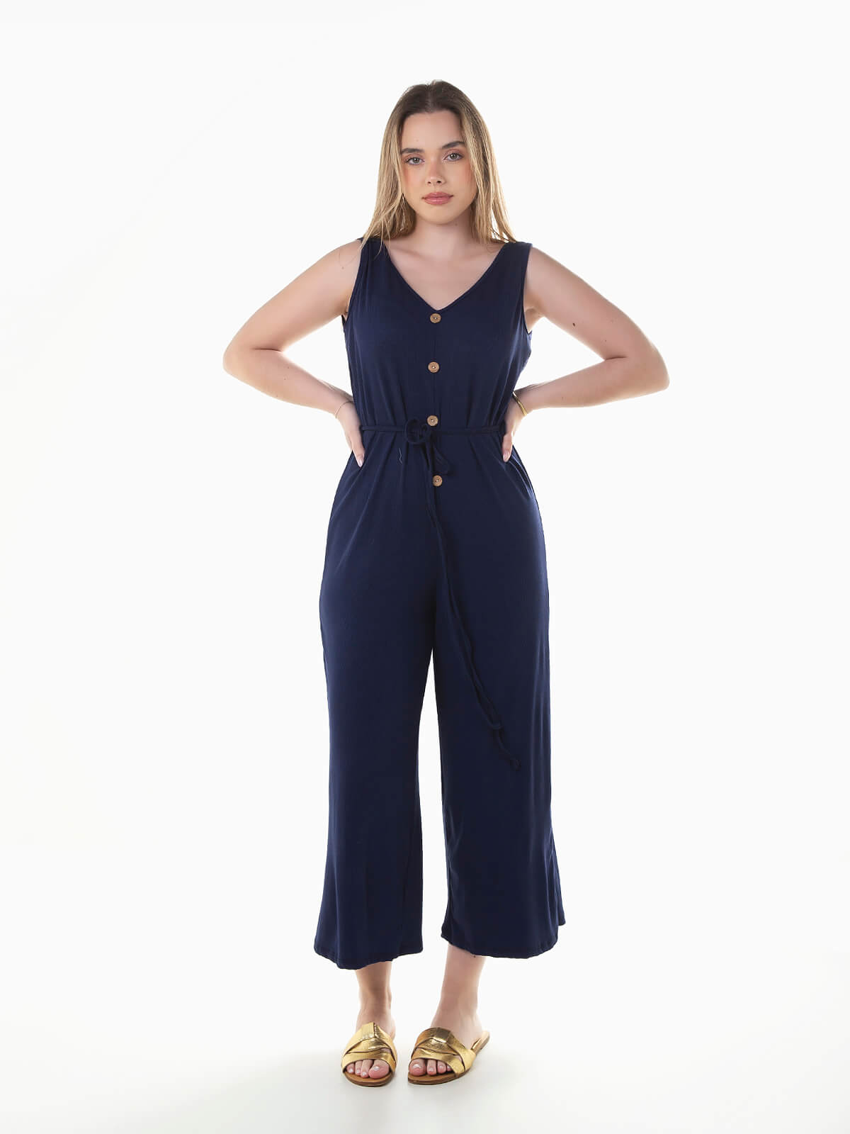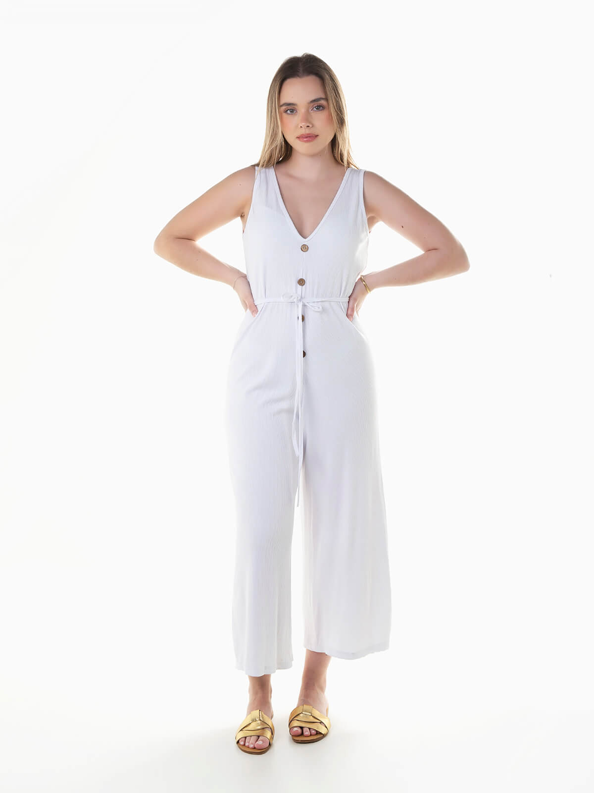 Macacão em malha canelada com botões decorativos em contraste. Macacão manga cava com decote em bico à frente e na parte posterior. Cordão para ajustar. Modelo curto e fluído.