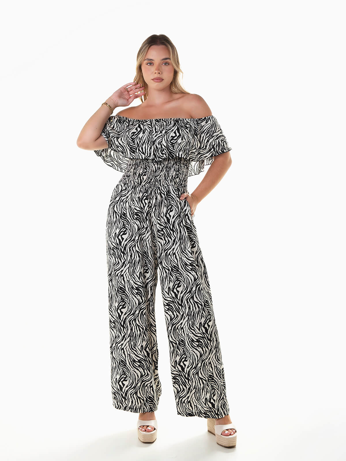 Macacão estampado zebra com ombros descobertos e encaixe de folho. Macacão comprido em tecido fresco e fluído com pormenor franzido na cintura. Decote barco. 2 bolsos.