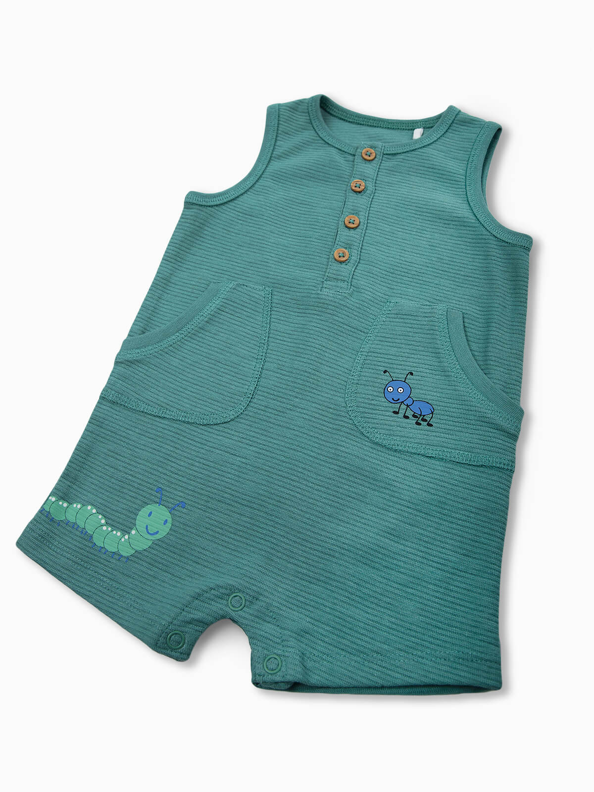 Macacão verde sem mangas para bebé menino. Macacão em malha canelada com 2 bolsos à frente. Estampado de formigas. Gola redonda com aperto de botões. Botões de pressão ocultos entrepernas.