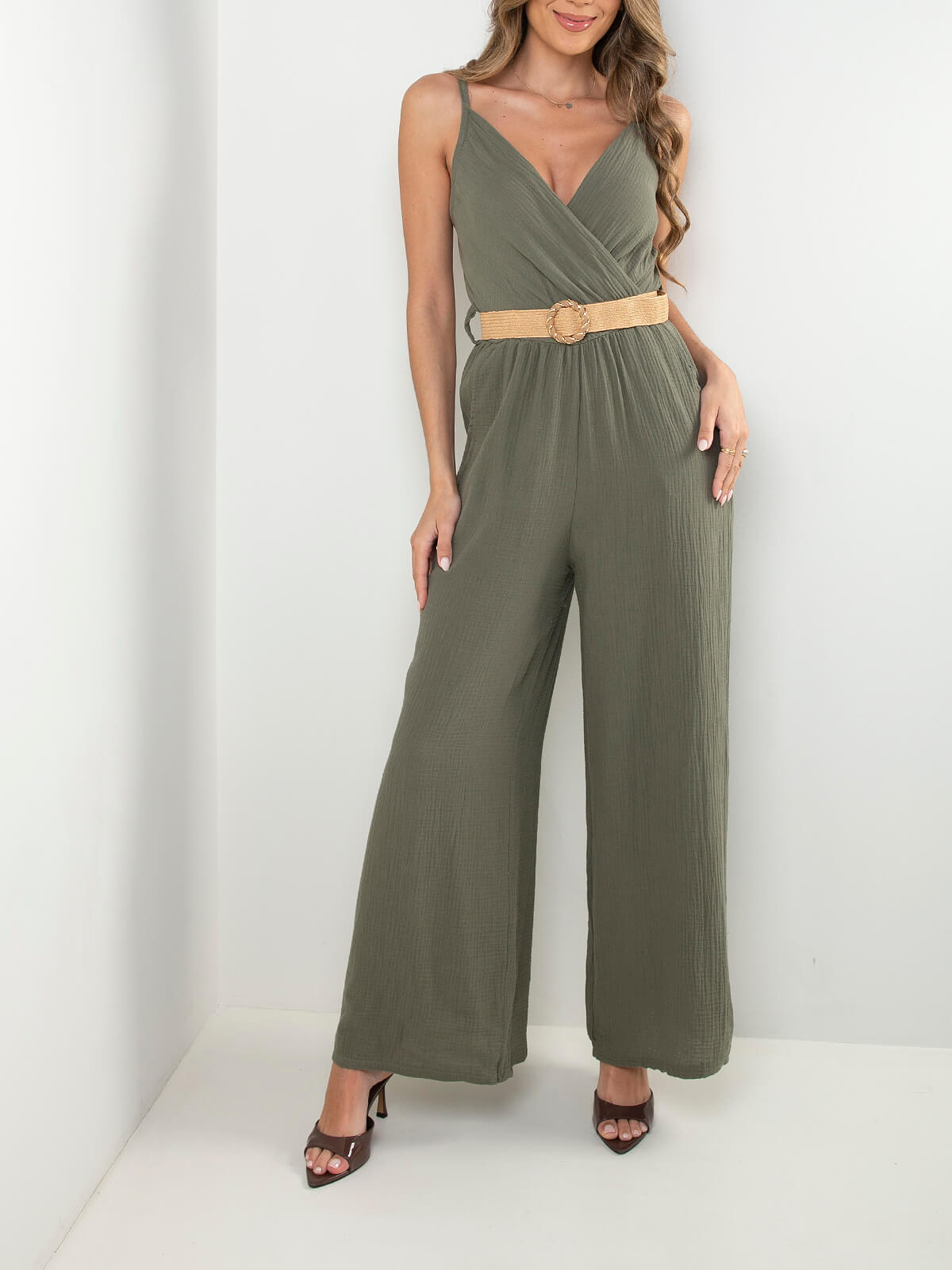 Macacão verde tropa em tecido tipo crepe, leve e confortável. Modelo de alças finas com decote cruzado, cintura marcada com cinto removível e bolsos laterais, ideal para um look prático e atual.