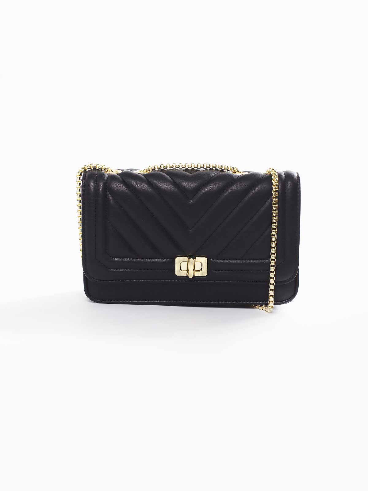 Mala tiracolo preta em pele sintética alças compridas de corrente dourada. Mala retangular com efeito acolchoado. Fecho de aba.