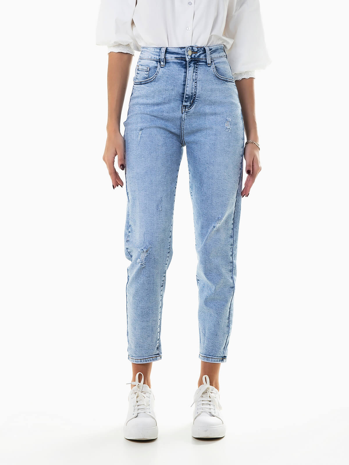 Mom jeans azul claro com leves rotos. Calças ganga elástica de cintura alta com 5 bolsos. Aperto de fecho éclair e botão.