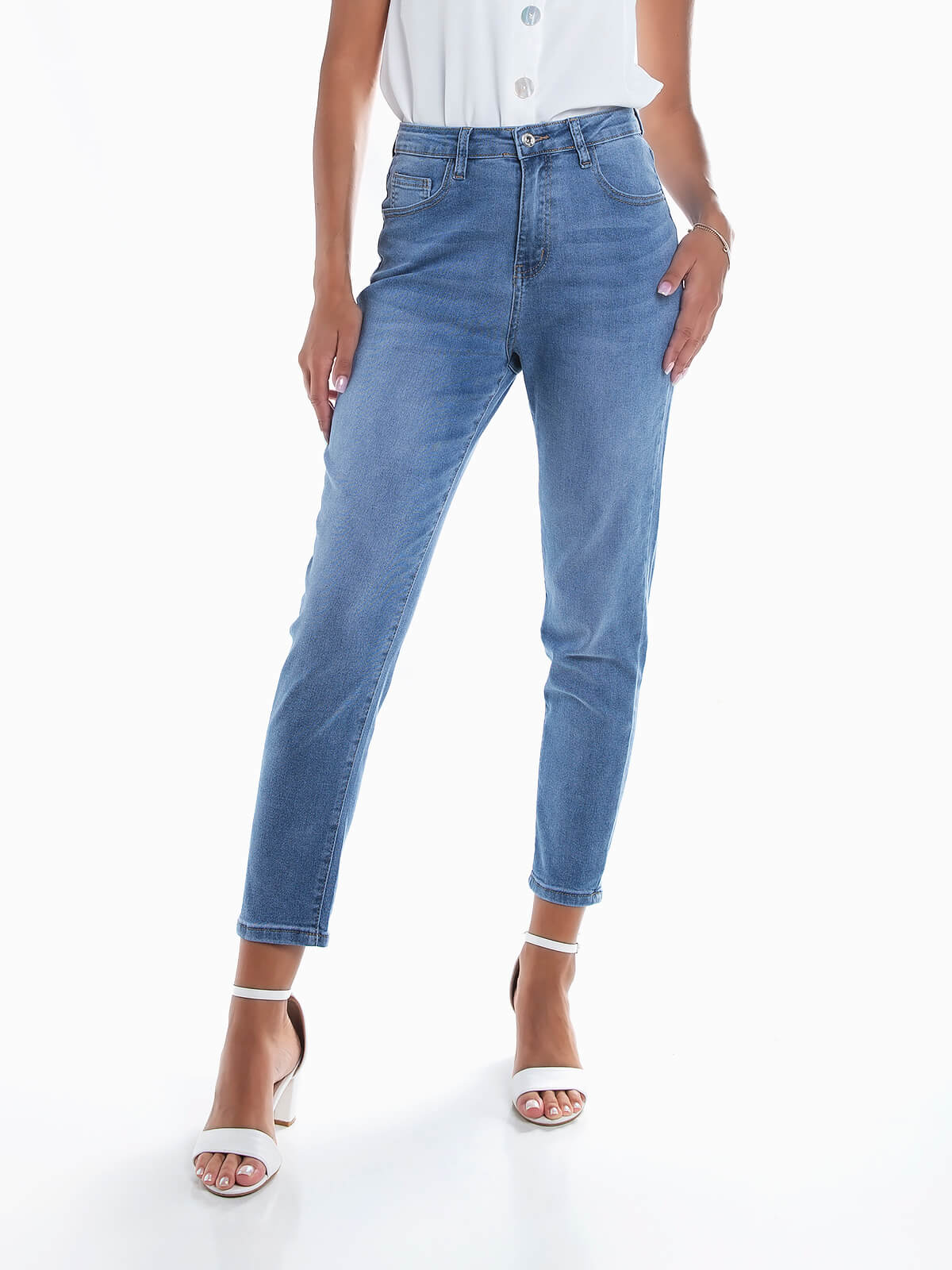 Mom jeans de lavagem azul claro para senhora. Calças ganga cintura alta com 5 bolsos. Aperto fecho éclair e botão.