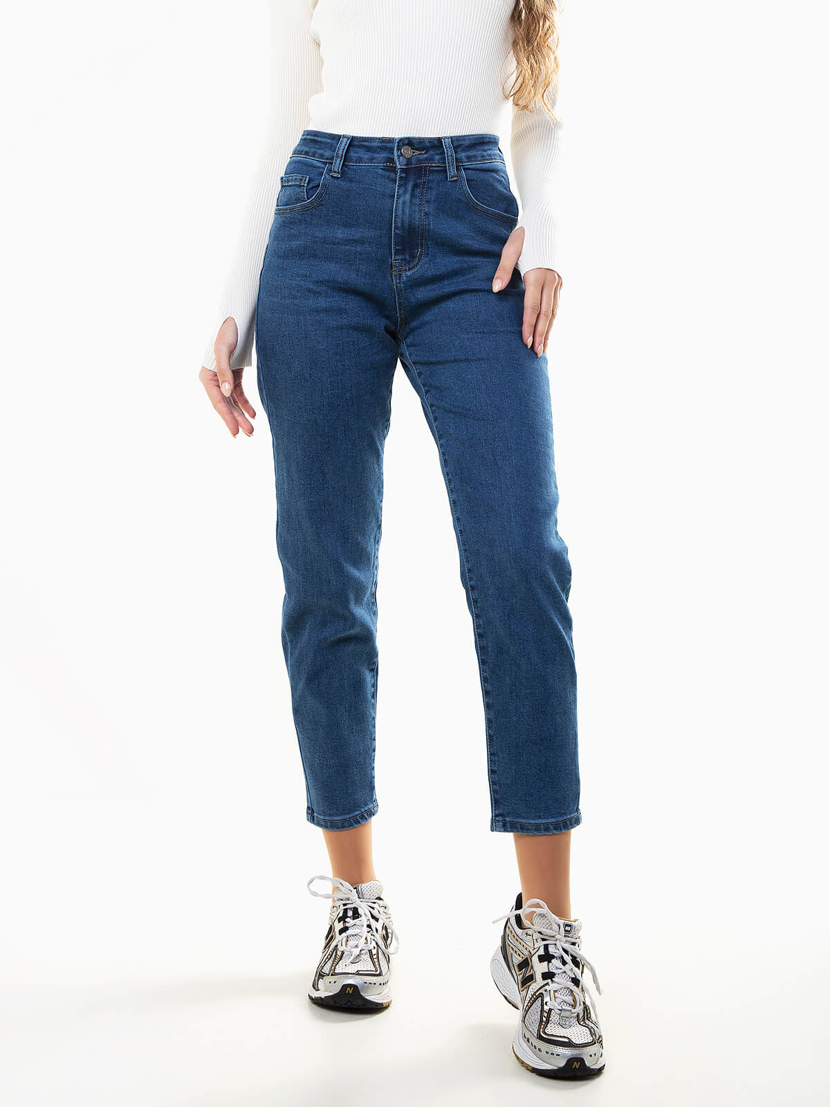 Mom jeans push-up de cintura alta com lavagem azul médio. Modelo de 5 bolsos com fecho de correr e botão. Combina com malha justa ou t-shirt básica e ténis para um look casual.