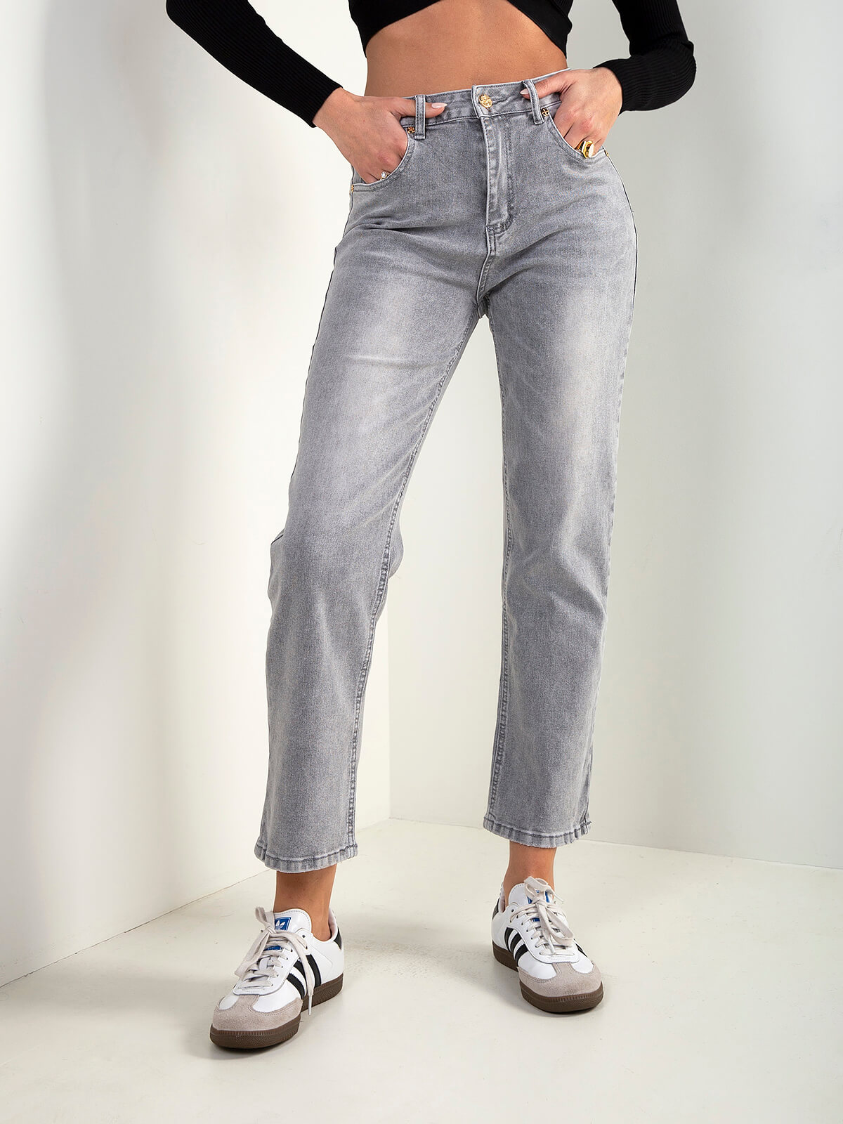 Mom jeans cinza de cintura alta com 5 bolsos e aperto com fecho éclair e botão. Confortáveis e versáteis, perfeitas para criar looks urbanos e descontraídos.