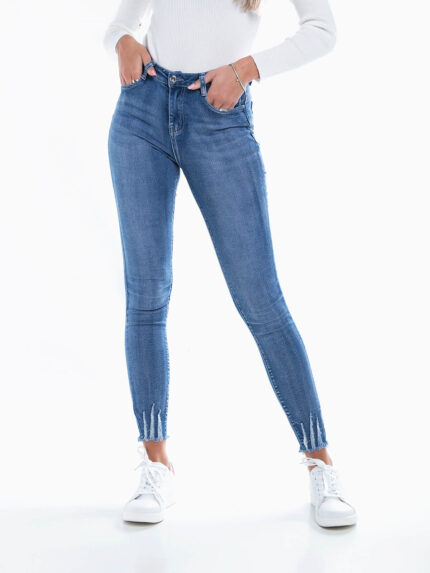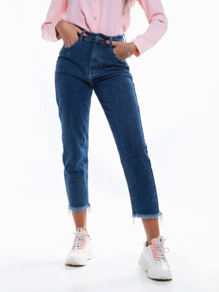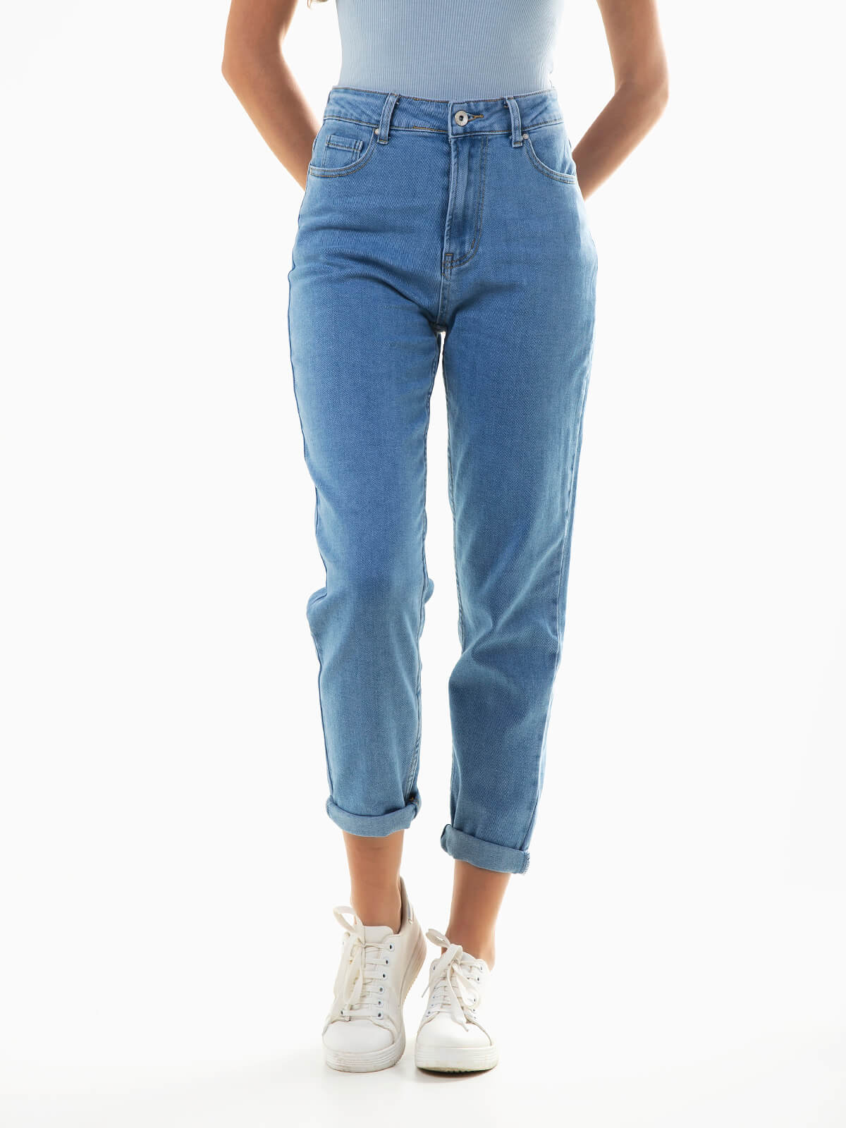 Calças ganga mom fit com dobra na base. Mom jeans de cintura alta com lavagem azul claro. 5 bolsos. Aperto fecho éclair e botão.