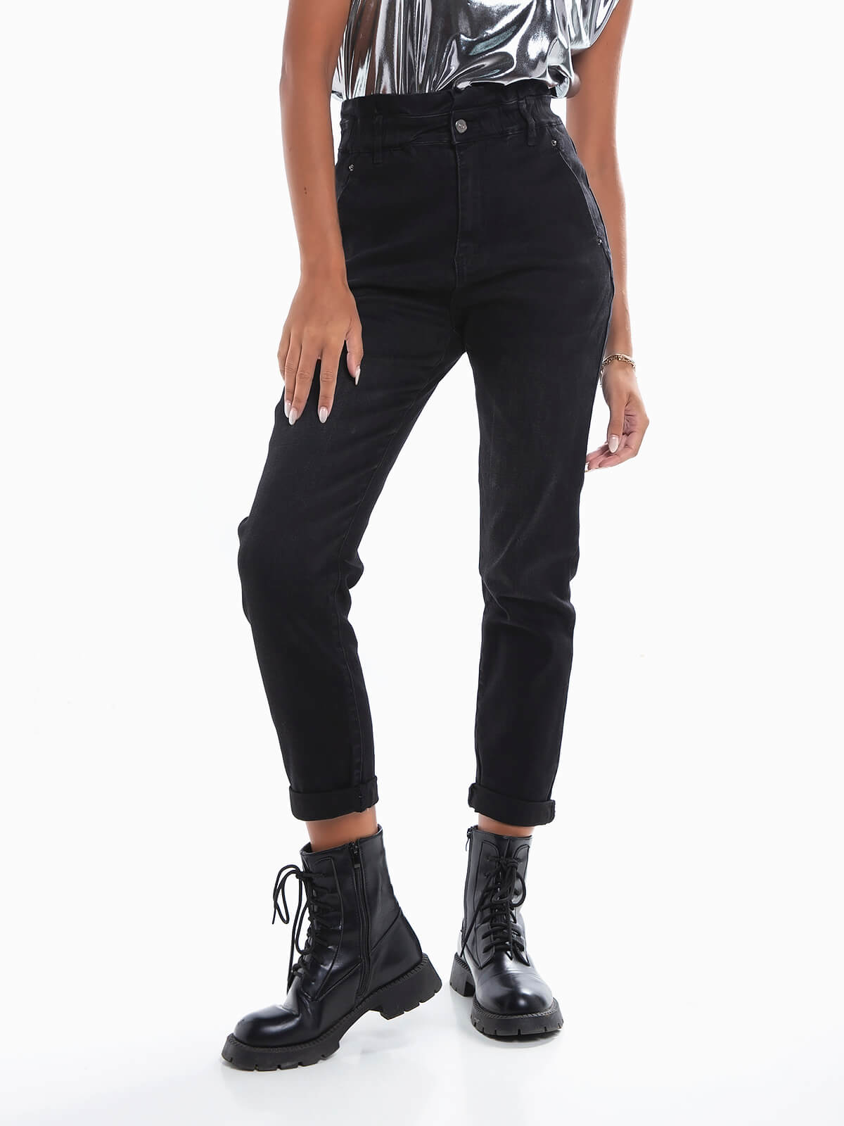 Mom jeans pretas com cintura alta elástica paperbag. Calças ganga com 4 bolsos. Aperto de fecho éclair e botão.