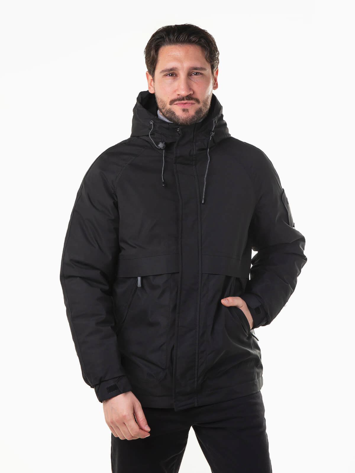 Parka acolchoada com capuz ajustável para homem. Parka impermeável manga comprida com dois bolsos e um interior. Gola alta. Punhos elásticos. Aperto de fecho zíper e botões de pressão.