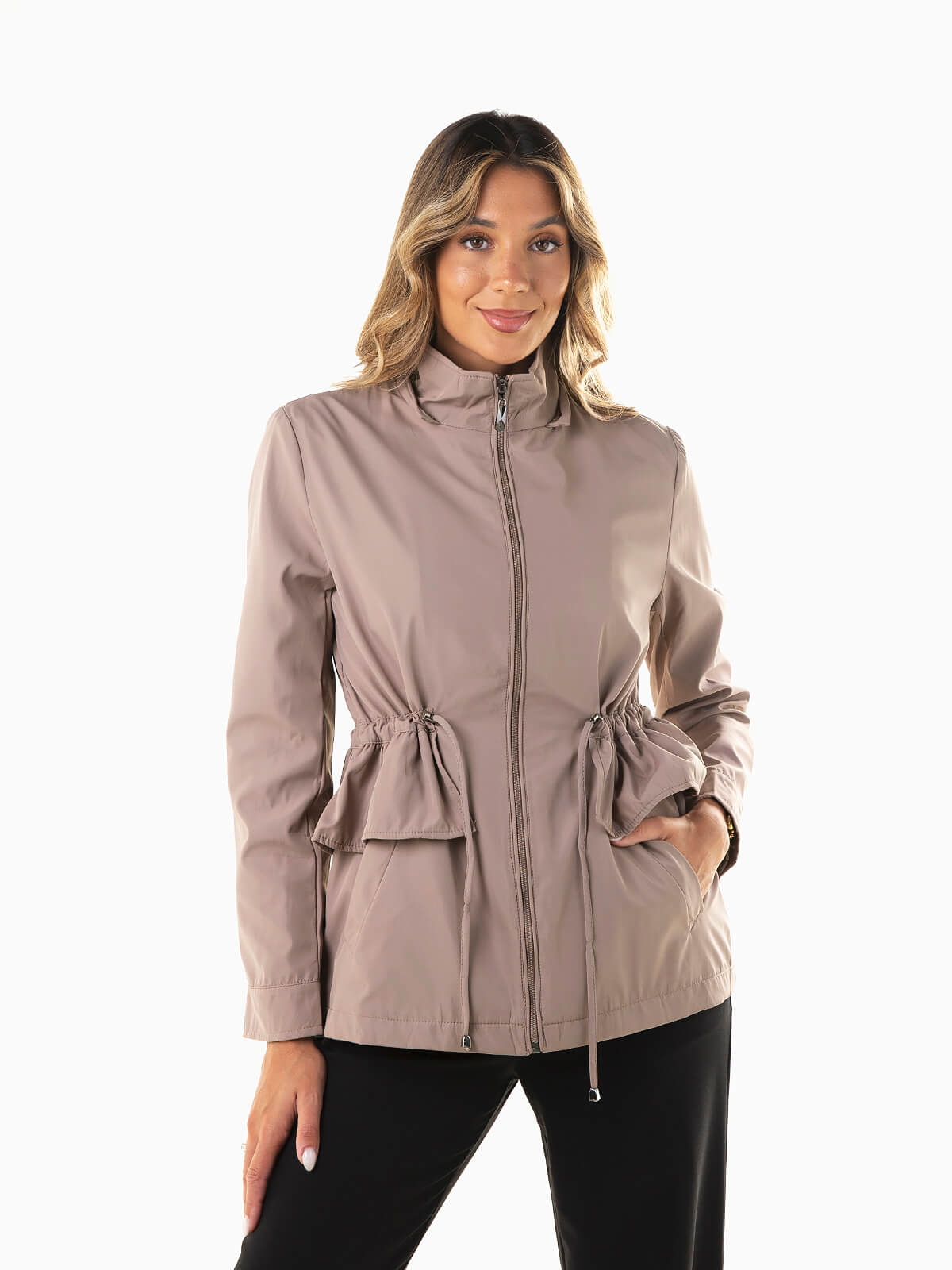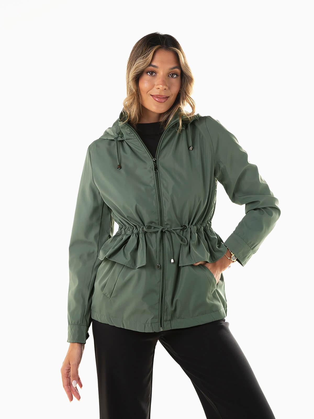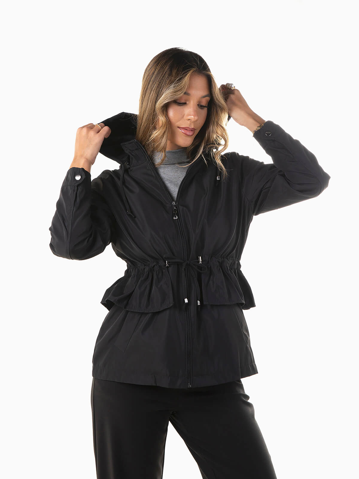 Parka feminina de meia-estação com capuz ajustável e removível. Modelo cintado com folho e cordão na cintura para definir a silhueta. Fecho éclair frontal e bolsos funcionais. Prática, moderna e versátil para o dia a dia.