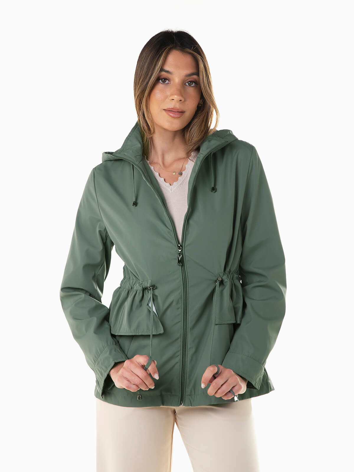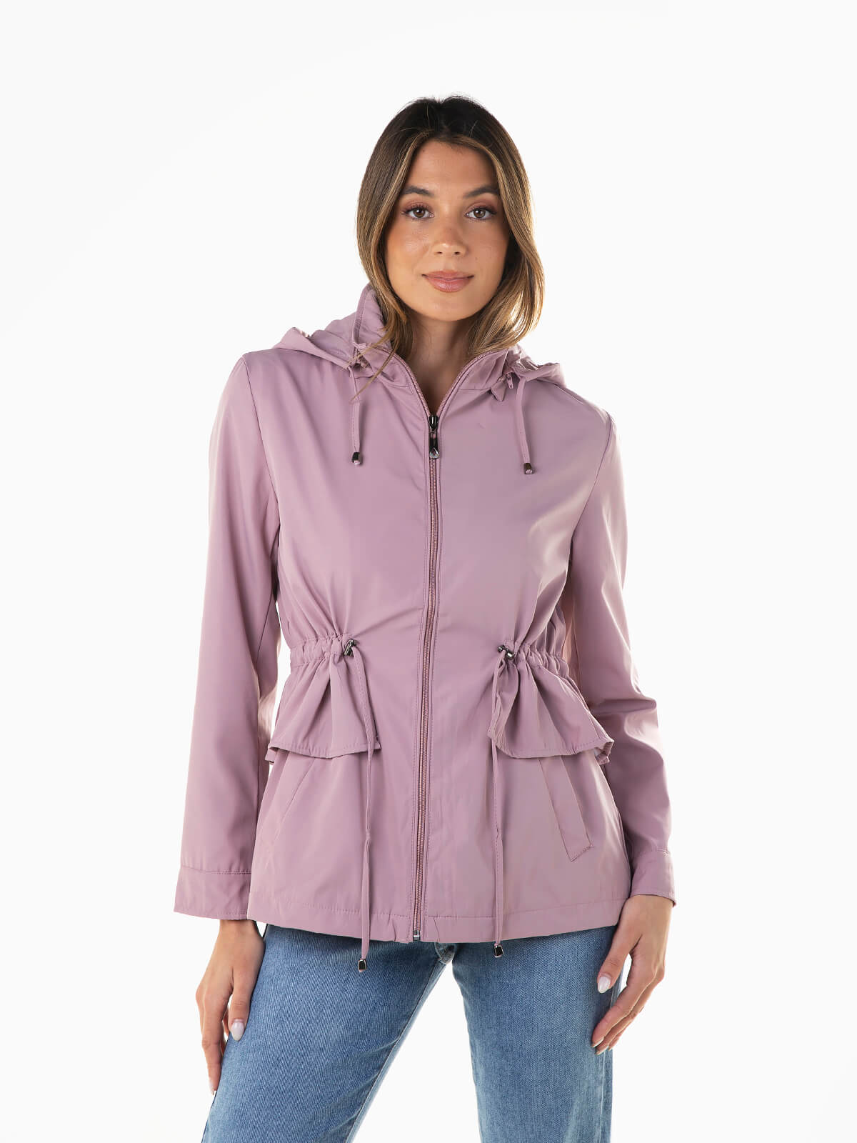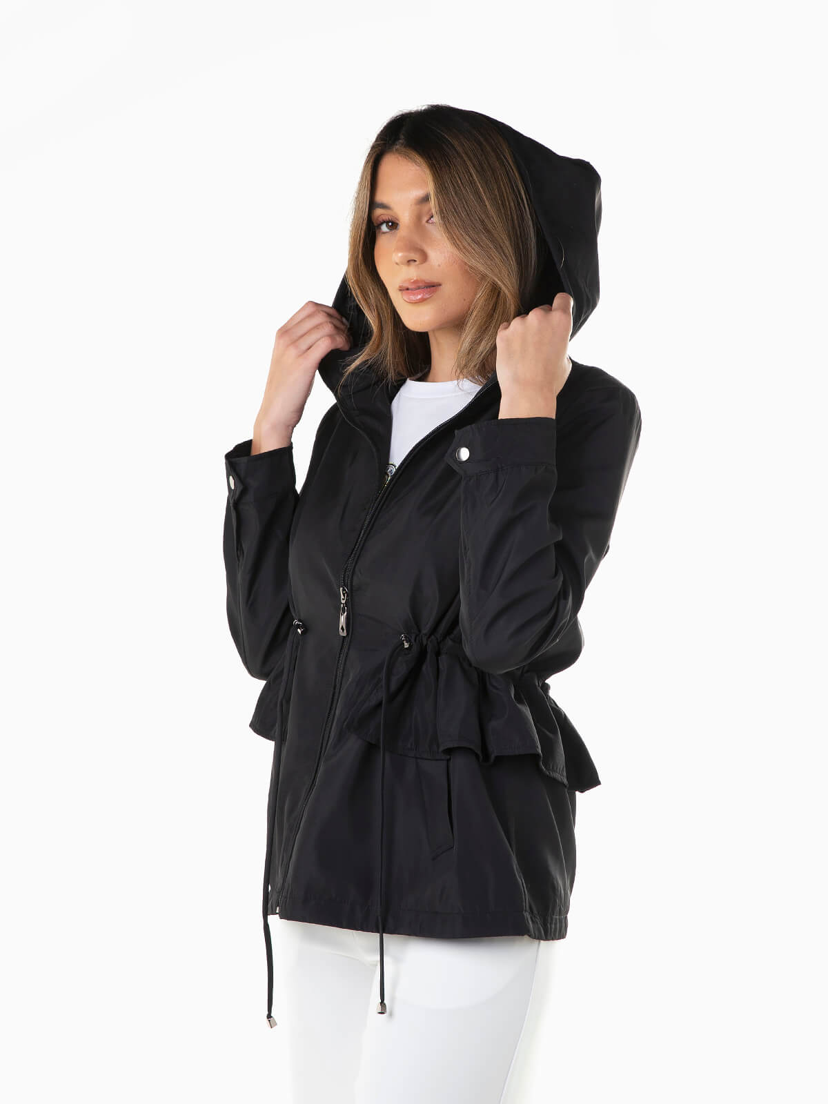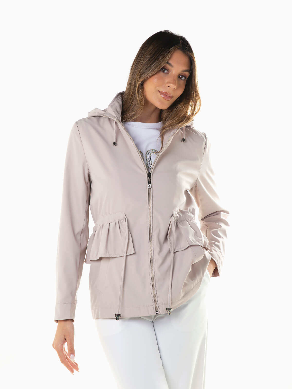 Parka com capuz removível e cintura com cordão para ajustar. Parka com proteção para chuva ligeira e folhos aplicados. Punhos abotoados. 2 bolsos. Gola alta. Aperto de fecho zíper.