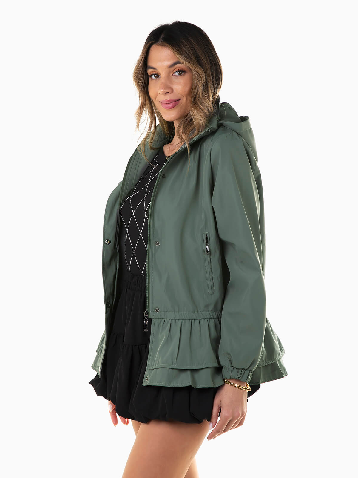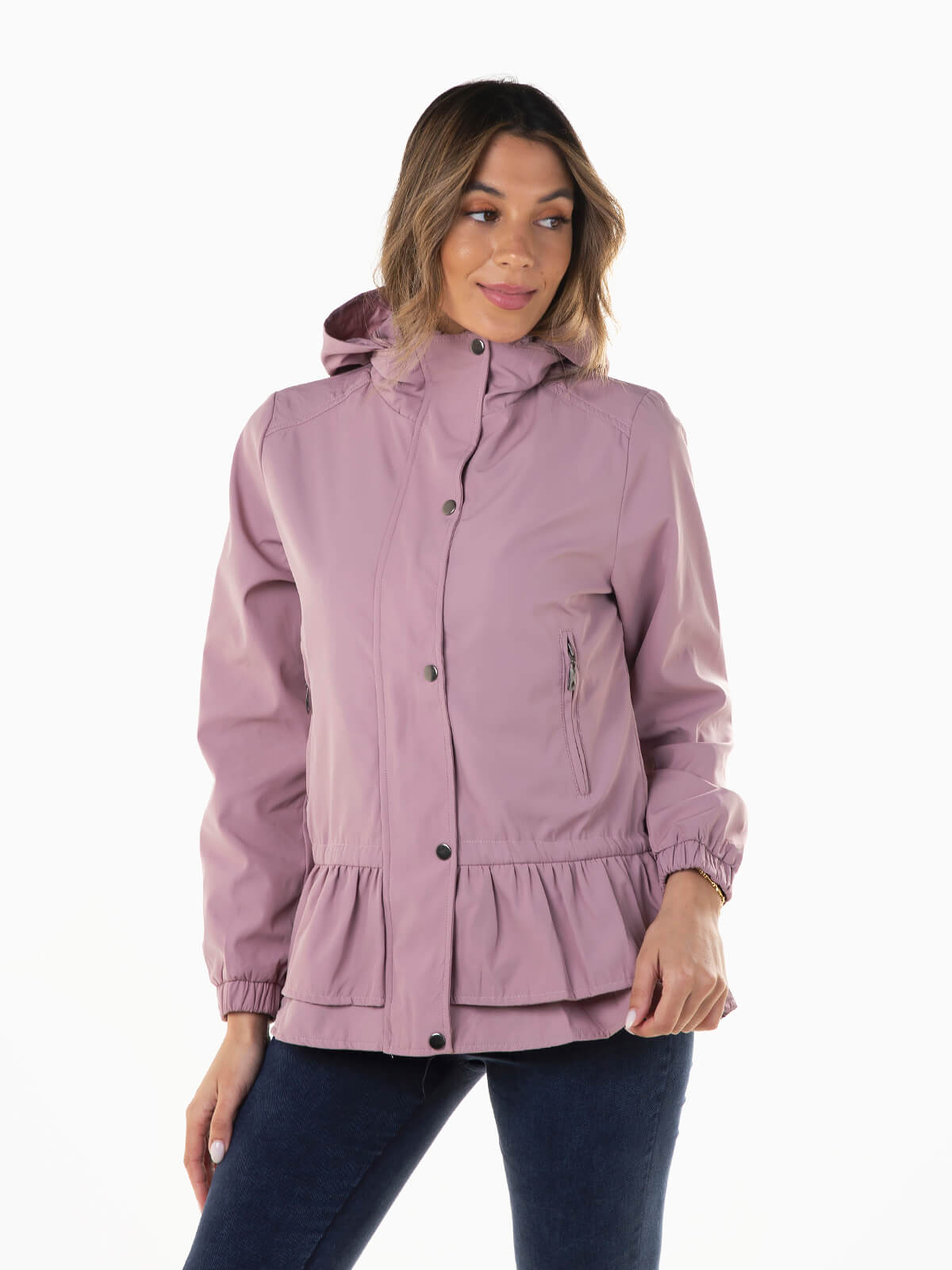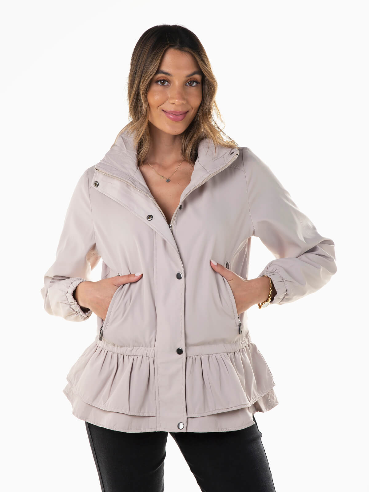 Parka para senhora com interior forrado e folhos aplicados na base. A gola alta conta com um fecho que permite guardar o capuz no seu interior, tornando a peça mais versátil. 2 bolsos. Punhos elásticos. Aperto de fecho zíper e botões de pressão.