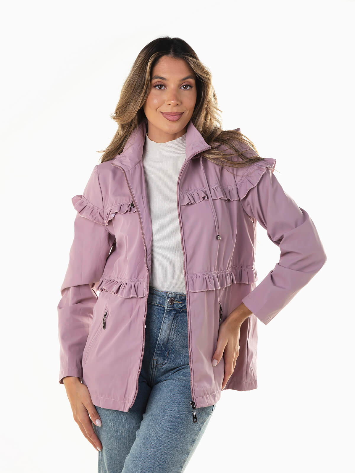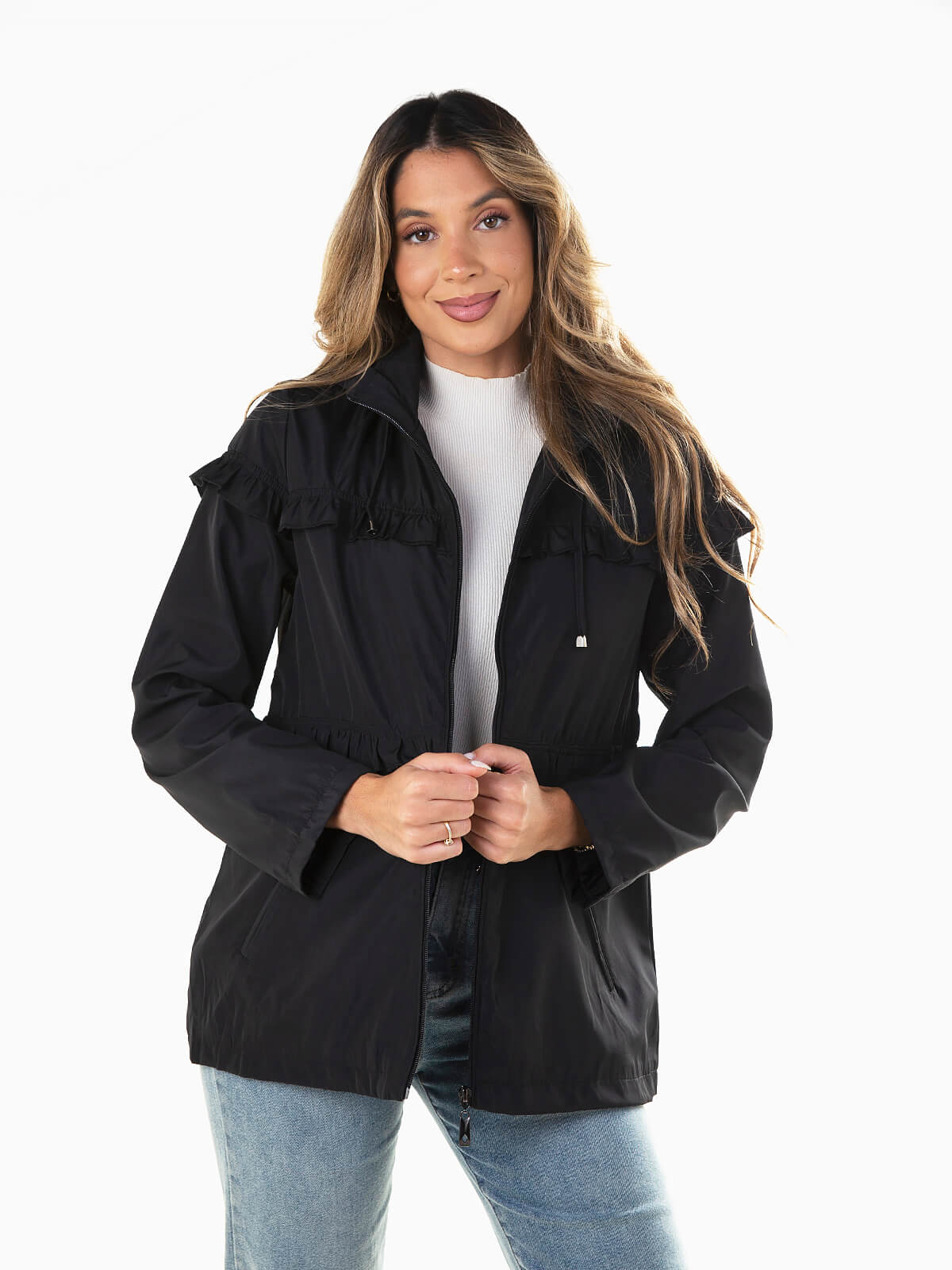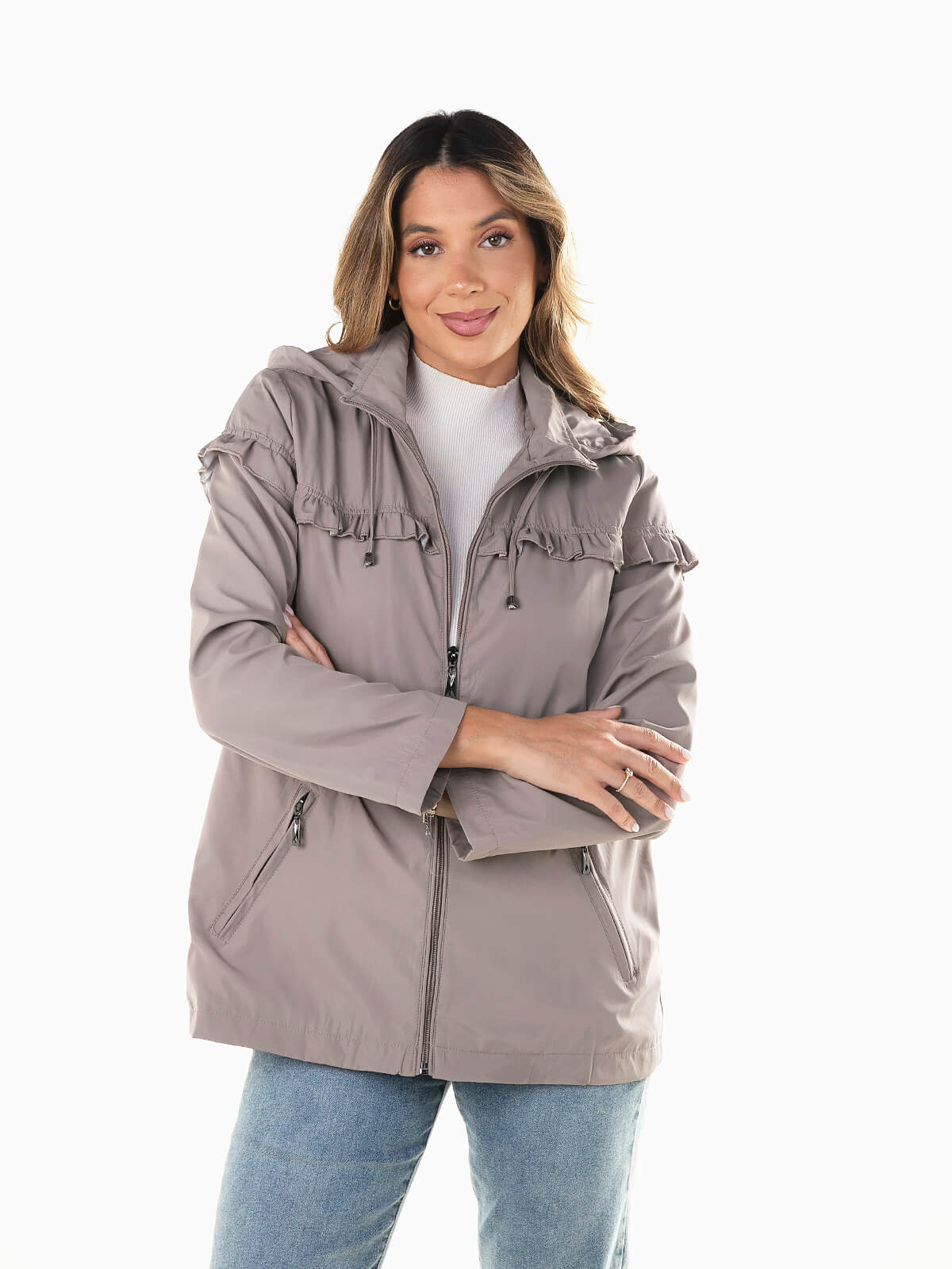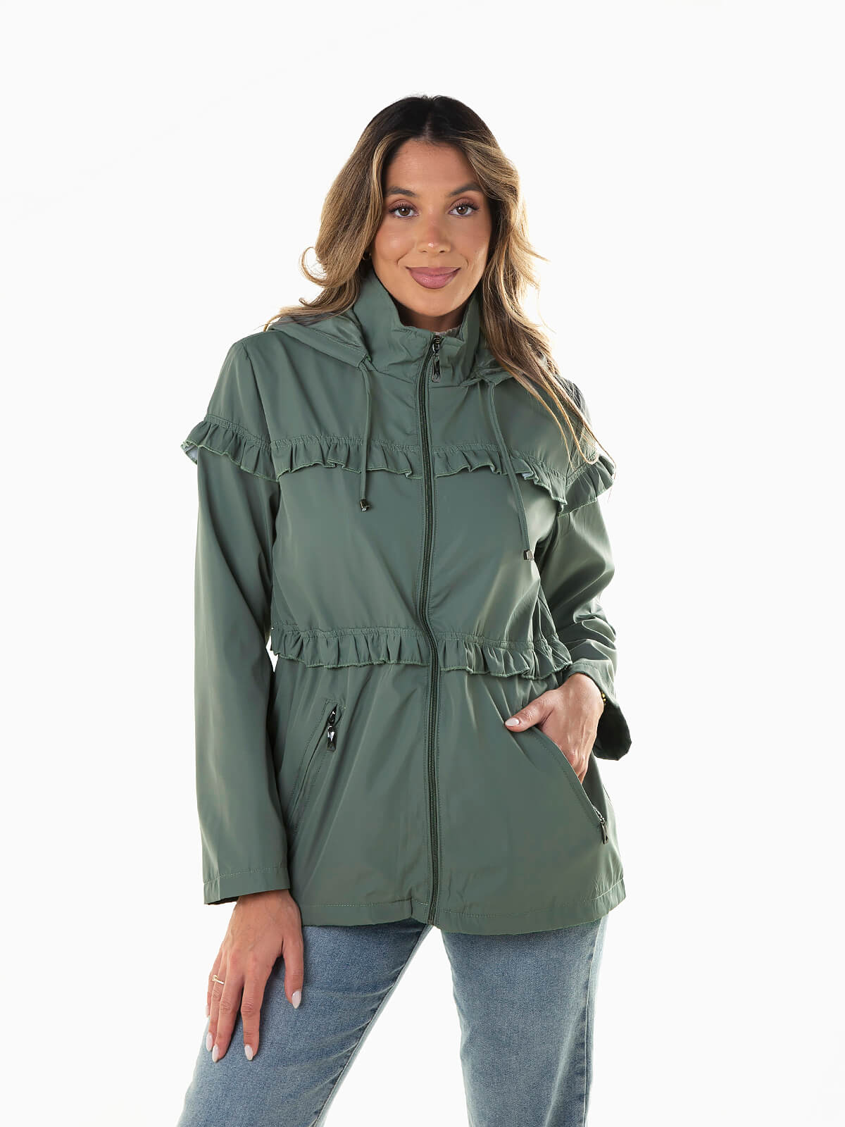Parka para senhora com interior forrado e folhos aplicados. Parka com proteção para chuva ligeira. Capuz removível e cintura com cordão para ajustar. 2 bolsos. Aperto de fecho zíper.