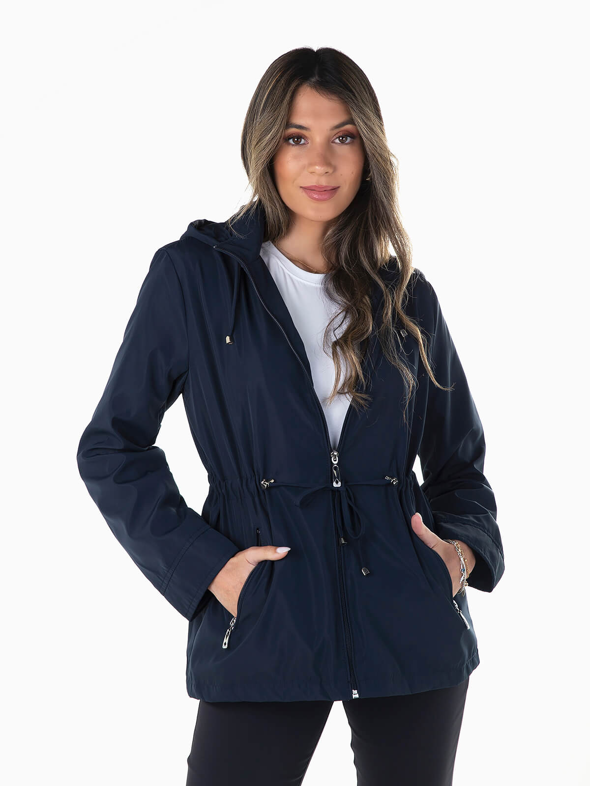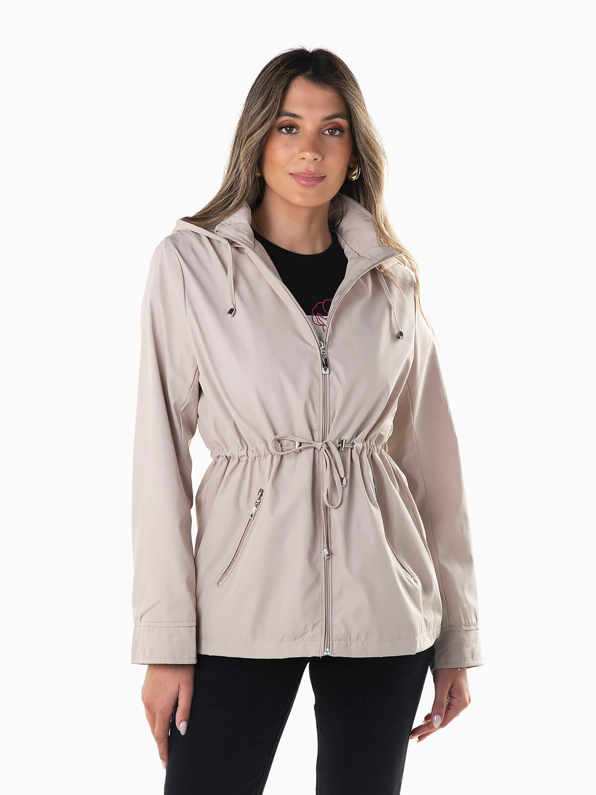 Parka impermeável com capuz removível e gola subida. Parka manga comprida com interior forrado e punhos abotoados. 2 bolsos. Cordão para ajustar na cintura e capuz.