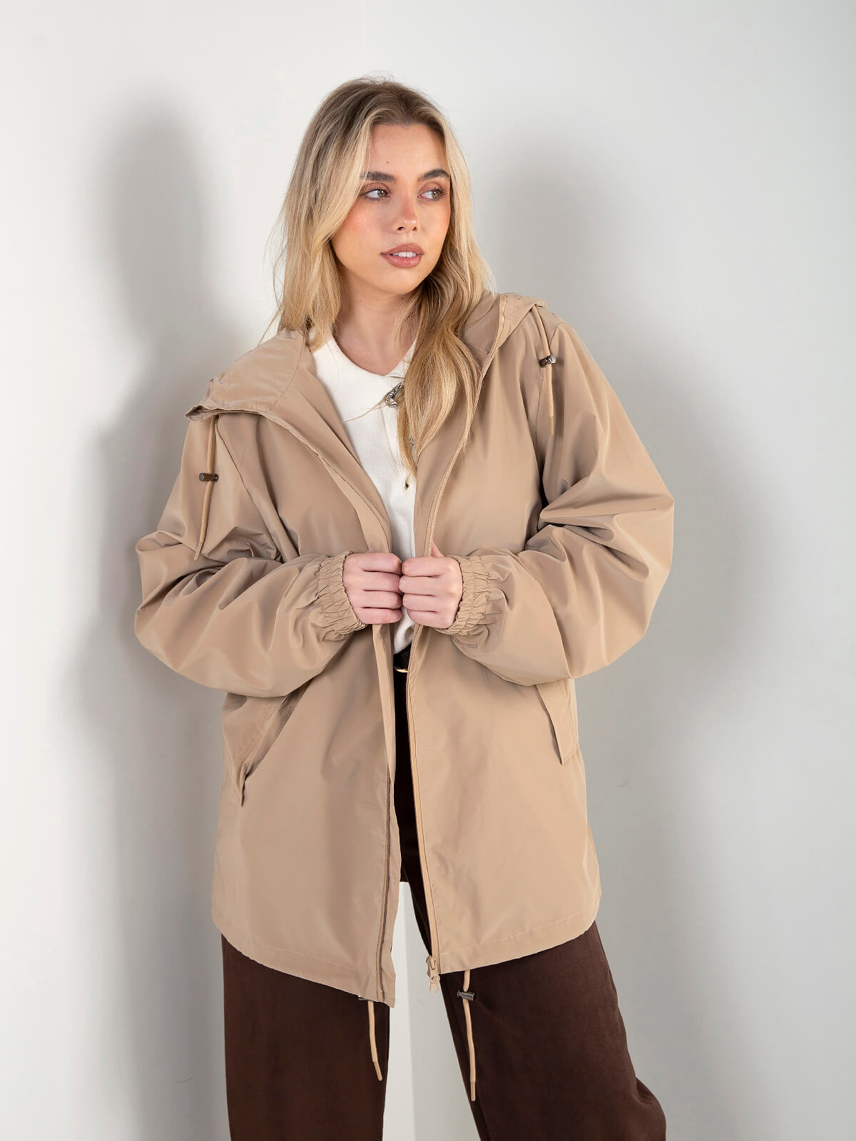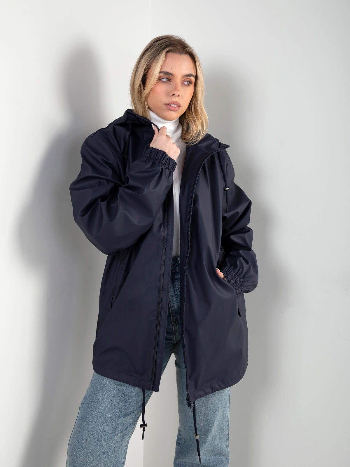 Parka feminina com capuz ajustável e fecho frontal. Modelo leve, impermeável e funcional, com bolsos laterais e acabamentos elásticos nos punhos. Ideal para looks de meia-estação, práticos e atuais.