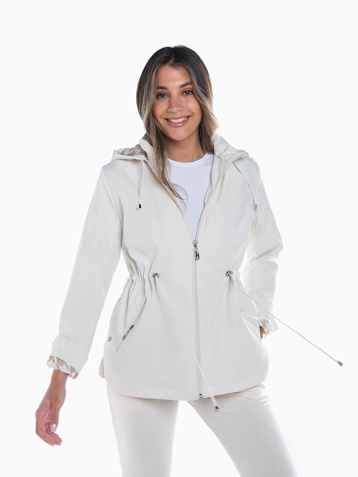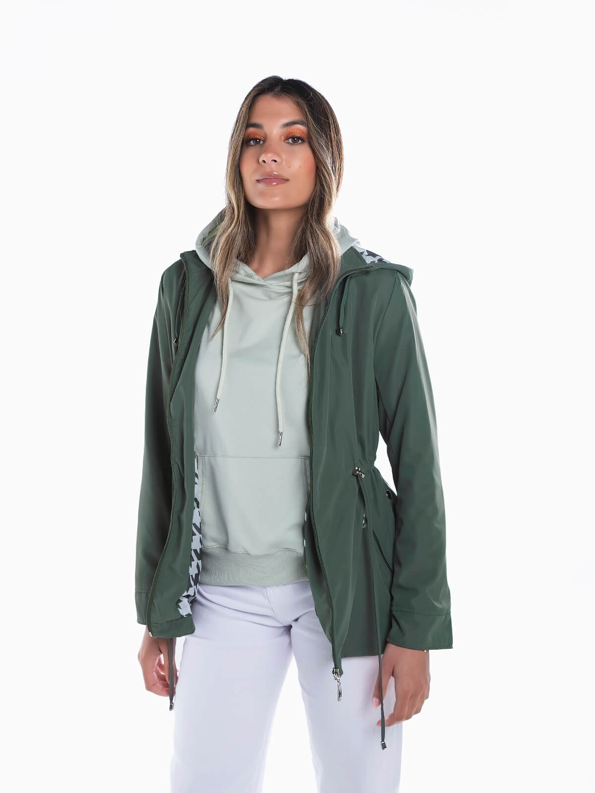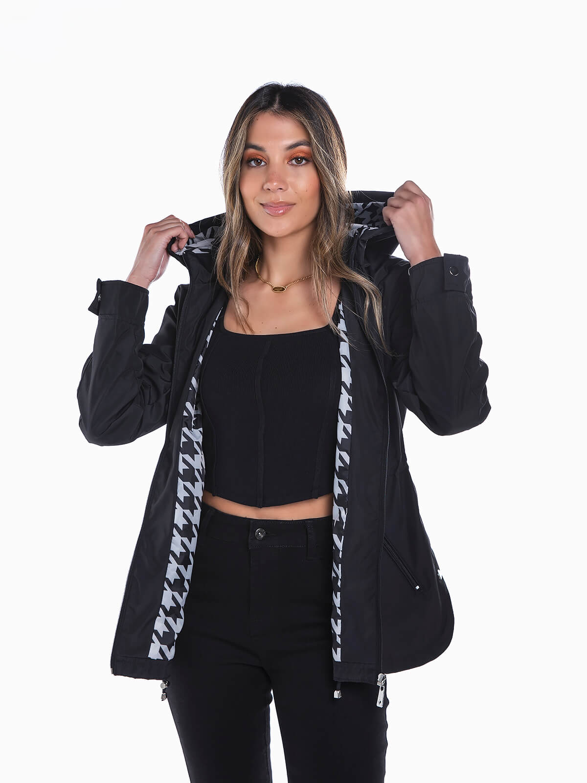 Parka com interior em pied-de-poule para senhora. Parka impermeável de gola alta com capuz removível. Manga comprida. Elástico na cintura para ajustar. 2 bolsos. Aperto de fecho zíper e botões de pressão.