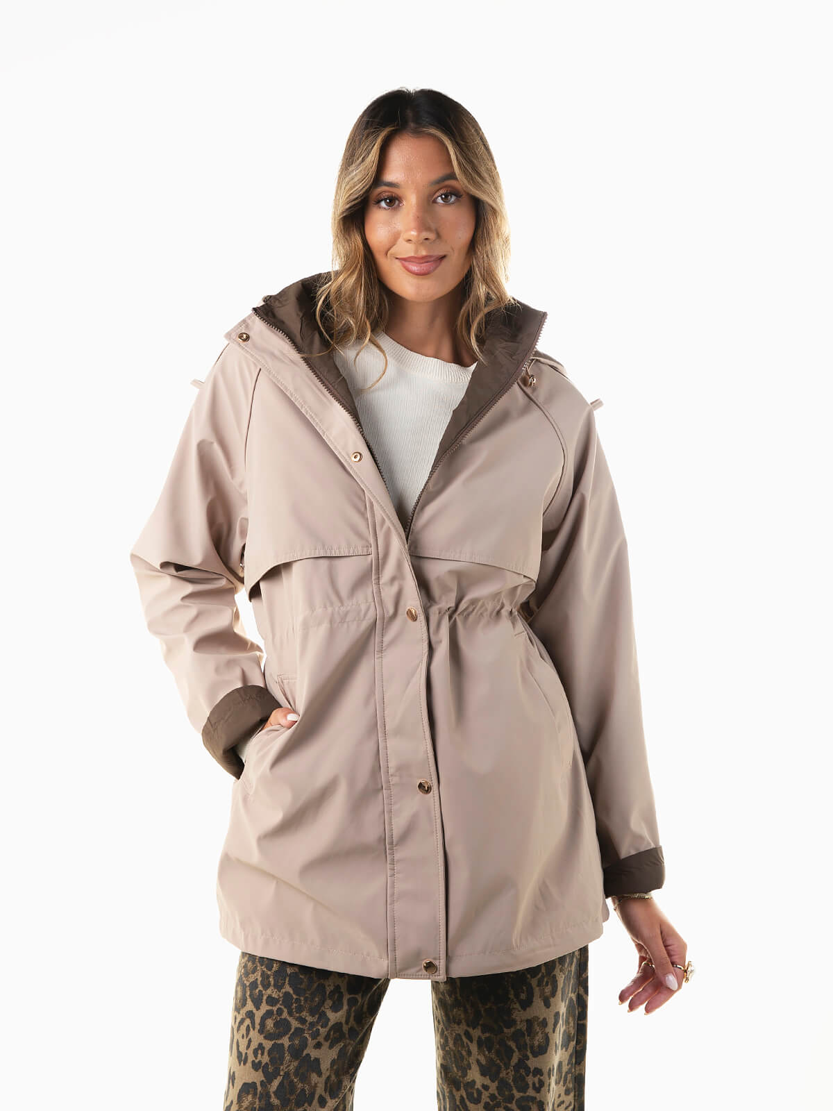 Uma parka feminina reversível que combina funcionalidade e sofisticação. Na parte frontal apresenta gola subida e um design moderno, enquanto a parte posterior remete ao estilo gabardine, com detalhe de fivelas decorativas nos ombros. 2 bolsos. Versátil e prática, é perfeita para a meia-estação, garantindo conforto, confiança e um look atual em qualquer ocasião.