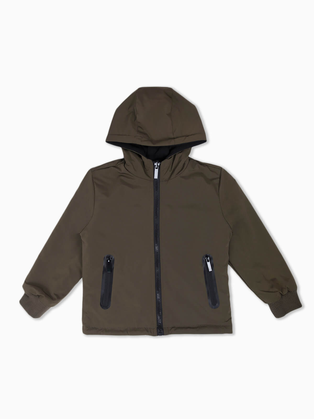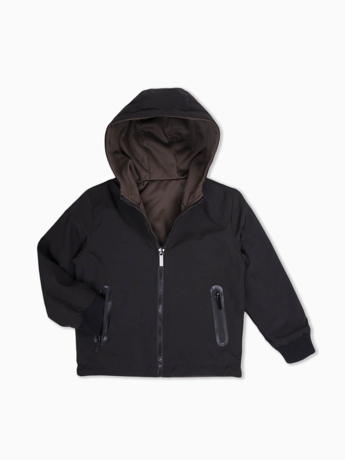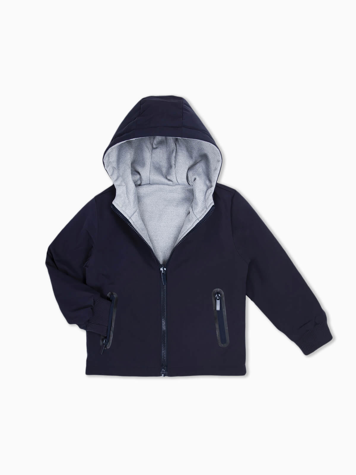 Parka reversível com capuz para menino. Parka impermeável com gola subida e bolsos frontais. Face oposta em felpa com bolsos na frente. Punhos elásticos.