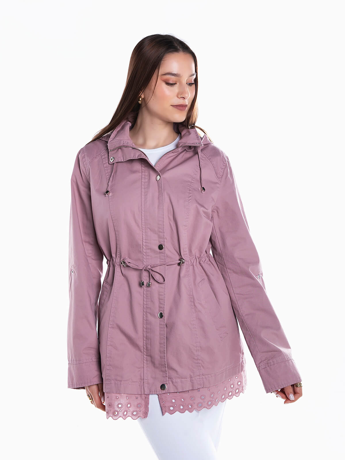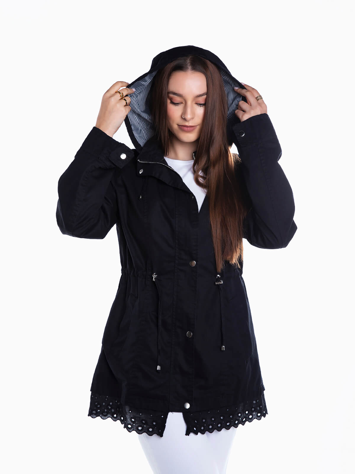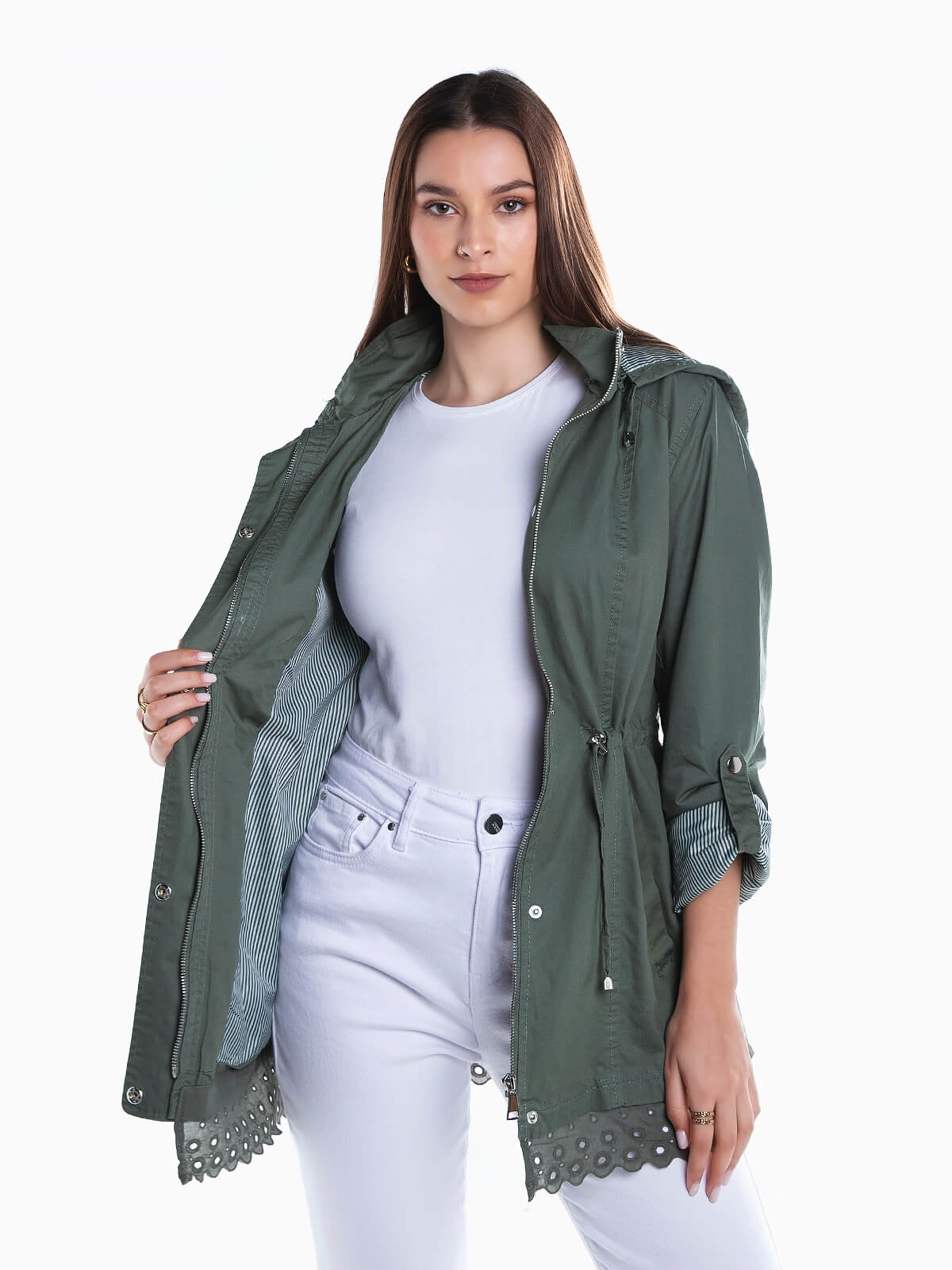 Parka de sarja com encaixe de bordado inglês na base. Capuz removível e forro às riscas. Manga comprida e presilhas. Cordão elástico na cintura para ajustar. 2 bolsos. Aperto frontal de fecho zíper e botões de pressão.