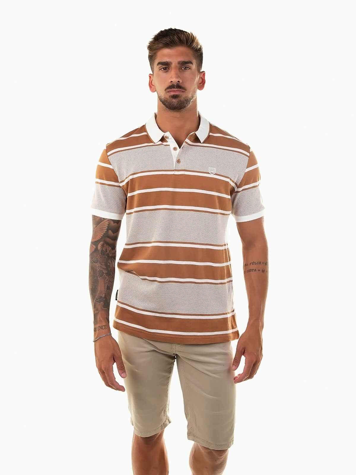 Polo de manga curta com padrão às riscas e encaixe texturizado que acrescenta dimensão ao look. Modelo com gola abas e símbolo discreto no peito. Carcela reforçada com 3 botões. Um essencial moderno, confortável e fácil de combinar no dia a dia.