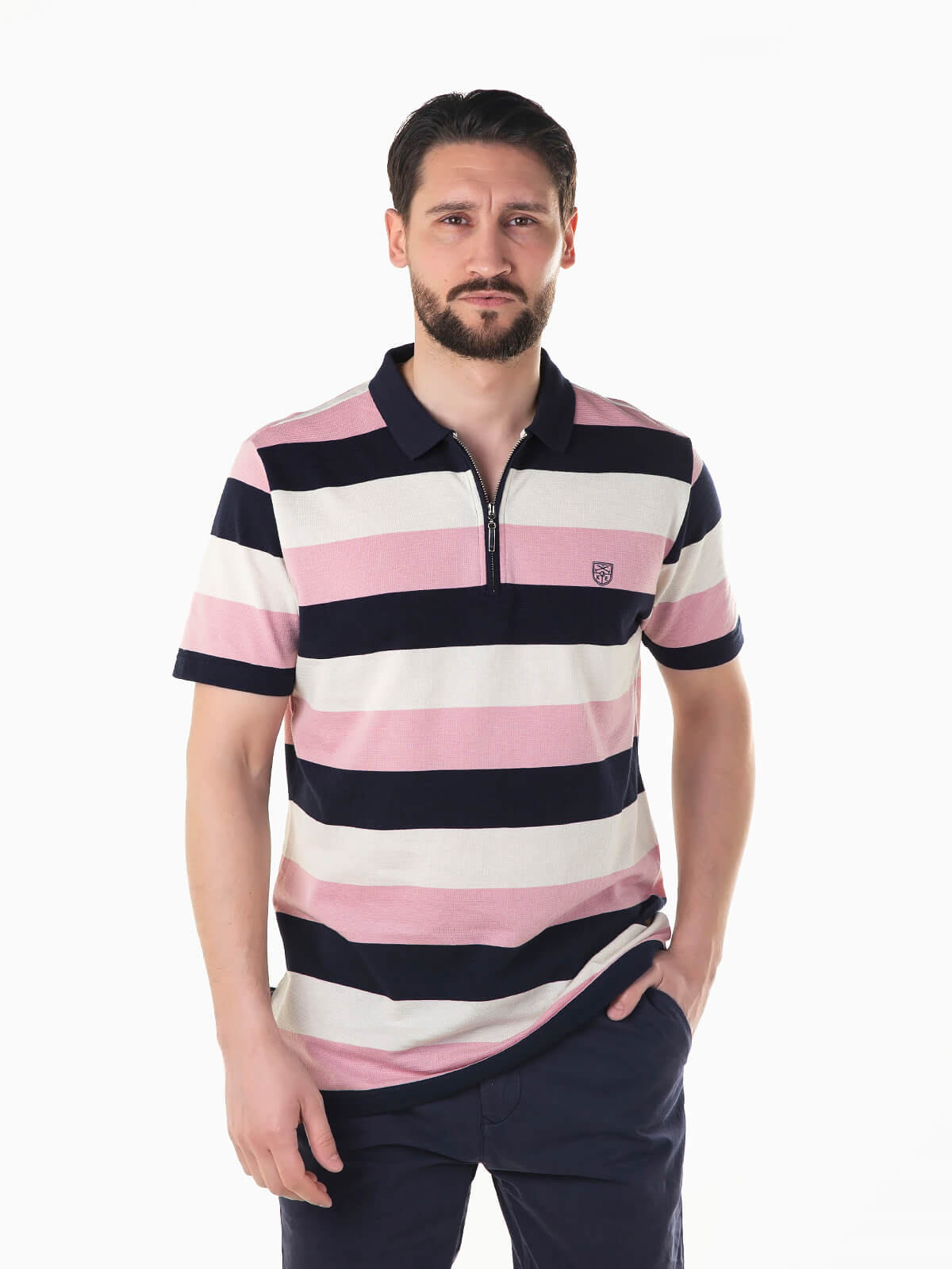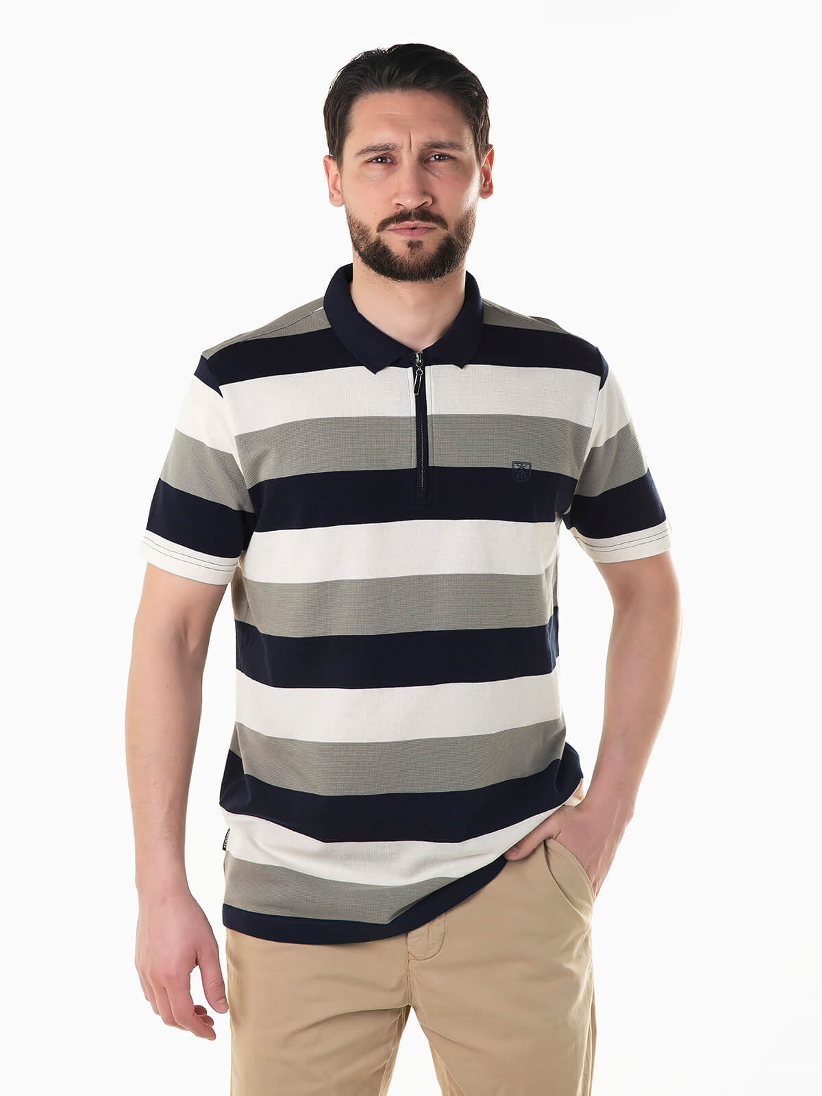 Polo às riscas com aperto de fecho e gola abas. Polo manga curta em algodão piqué para maior conforto e durabilidade. Símbolo no peito.