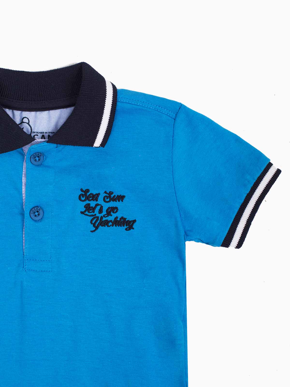 Polo azul de manga curta com letras bordadas no peito. Polo bebé com riscas nas mangas e gola clássica com botões.