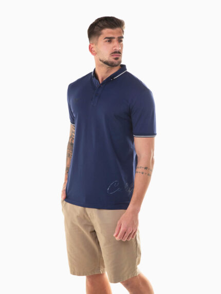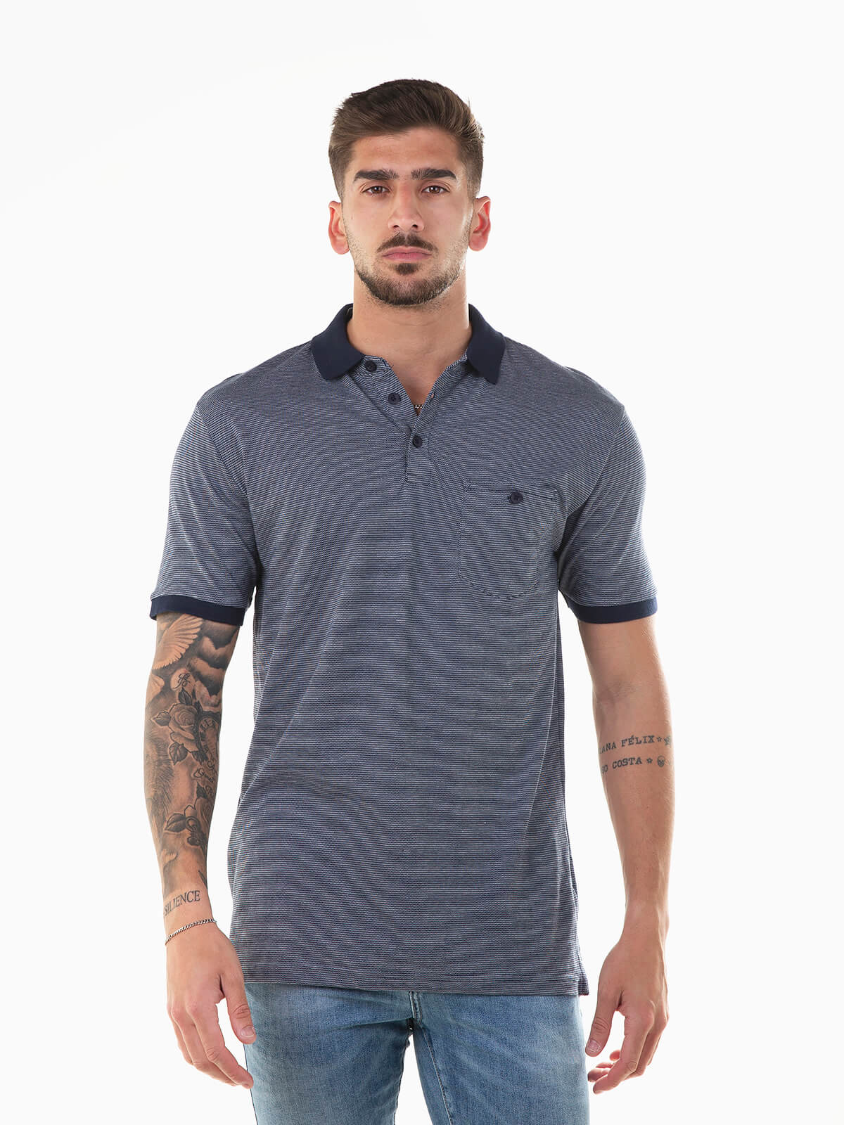 Polo azul marinho de manga curta com riscas para homem. Polo para homem com bolso no peito e gola abas. Carcela reforçada com 3 botões.