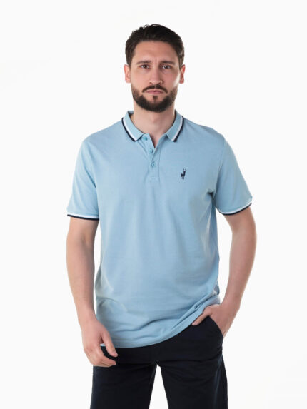 Polo azul marinho de manga curta com gola de abas e manga acabada em risca. Polo para homem em tecido piqué. Carcela reforçada com 2 botões.