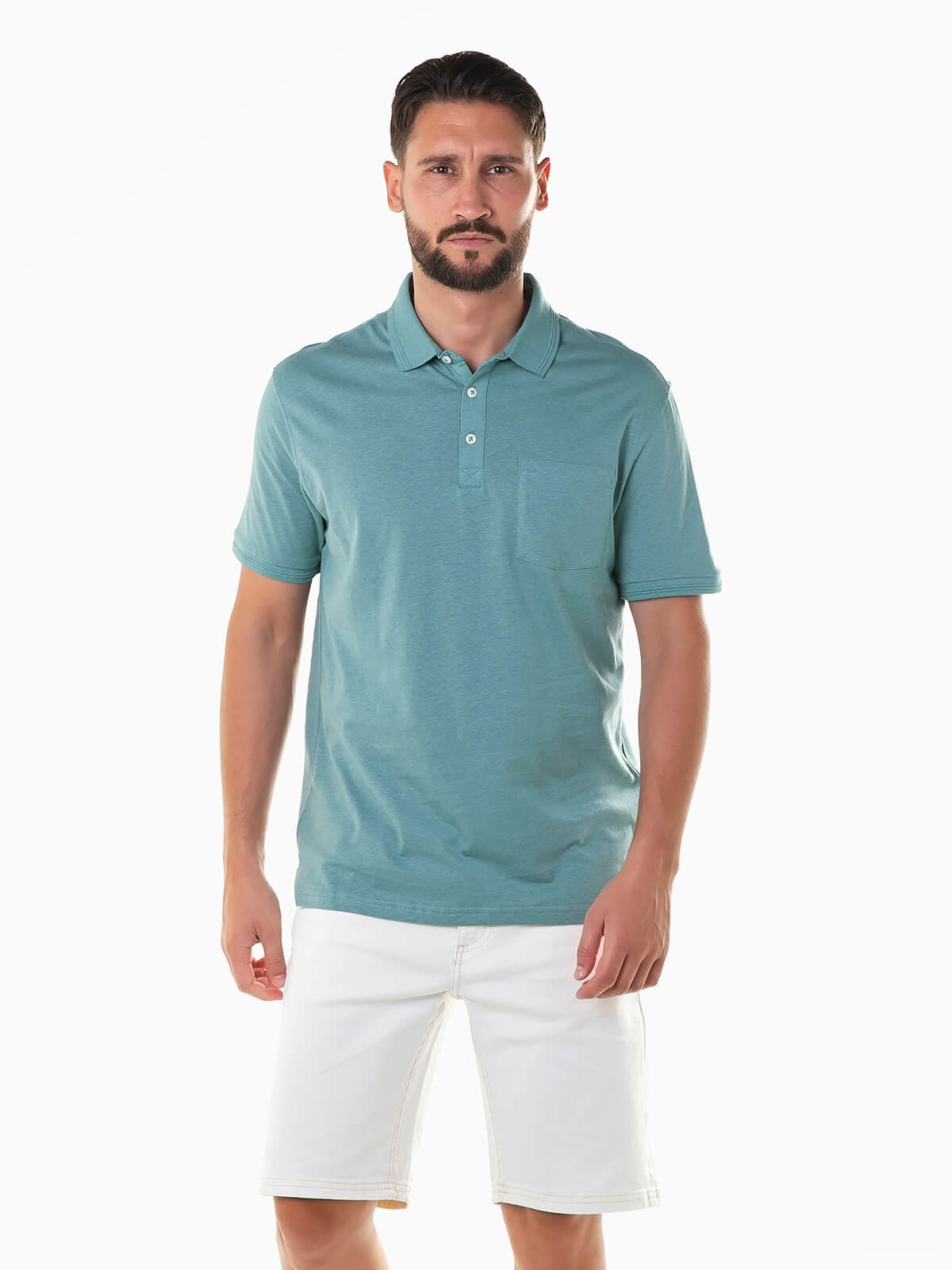 Polo básico com bolso no peito para homem. Polo manga curta com gola abas e carcela reforçada com 3 botões.