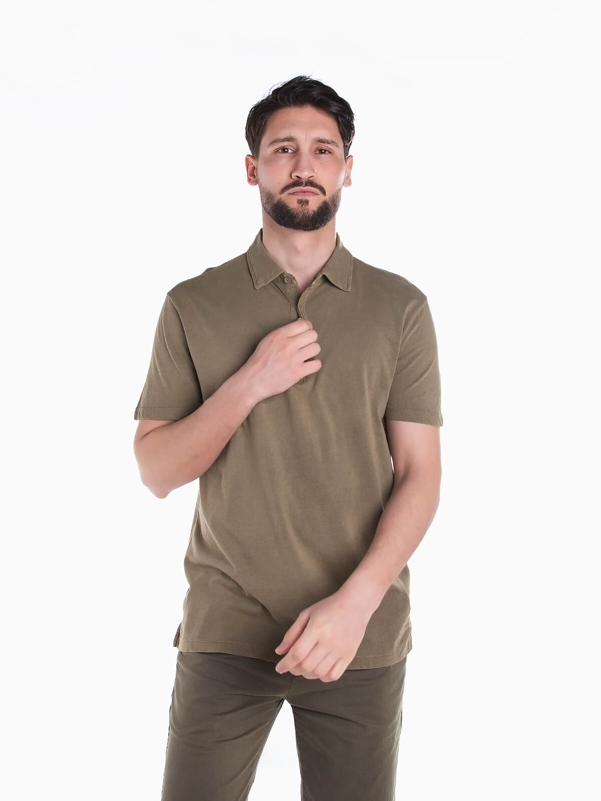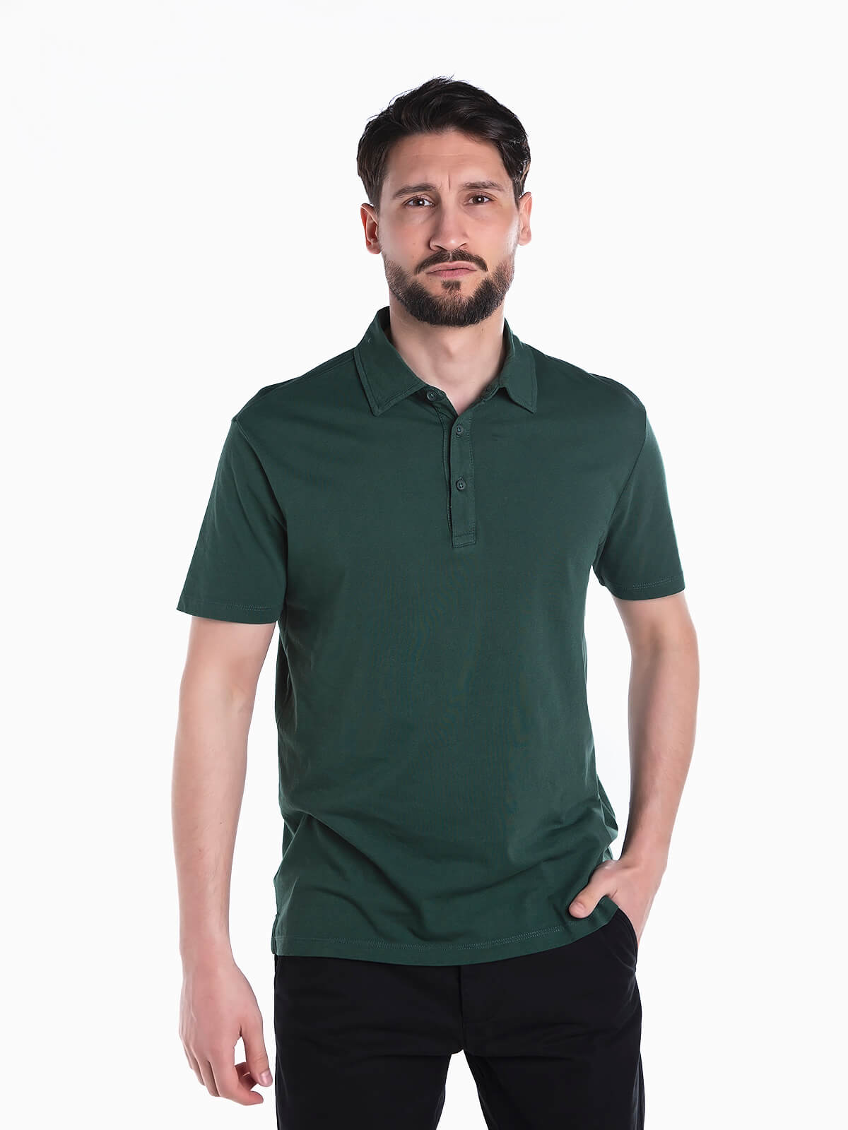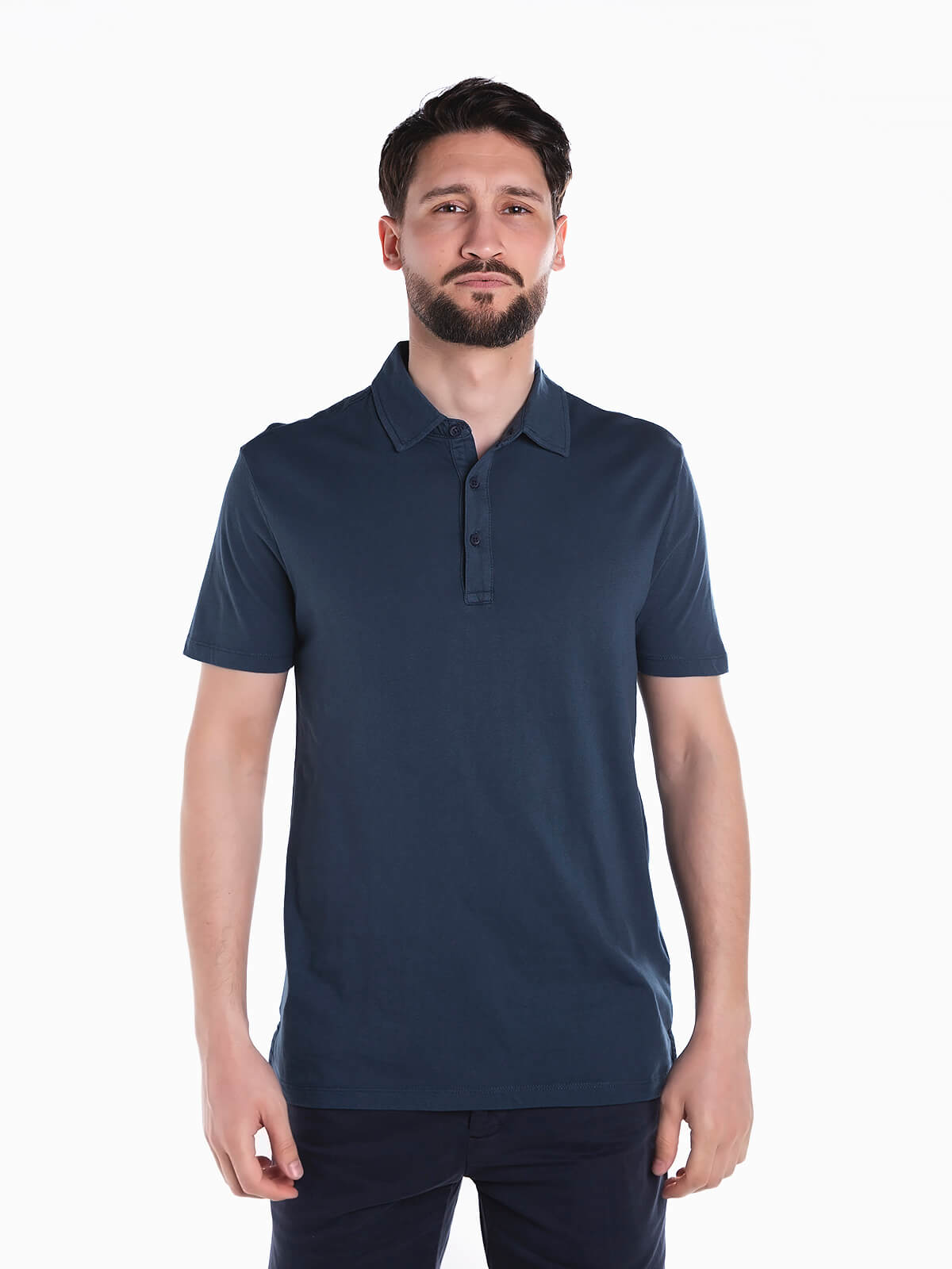 Polo básico de manga curta para homem. Polo em tecido 100% algodão com gola de abas. Carcela com 3 botões. Aberturas laterais na base.