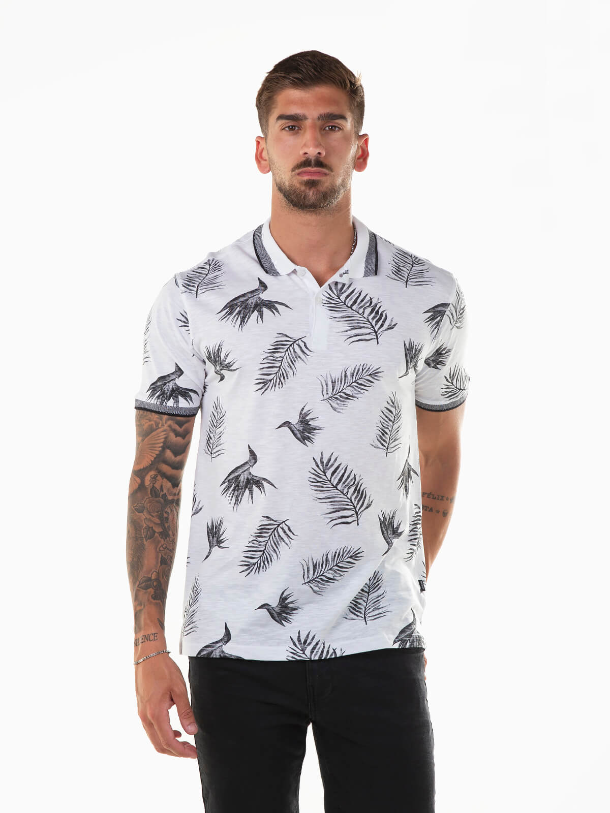 Polo branco de manga curta com folhas em contraste. Polo 100% algodão com gola abas. Carcela reforçada com 2 botões.