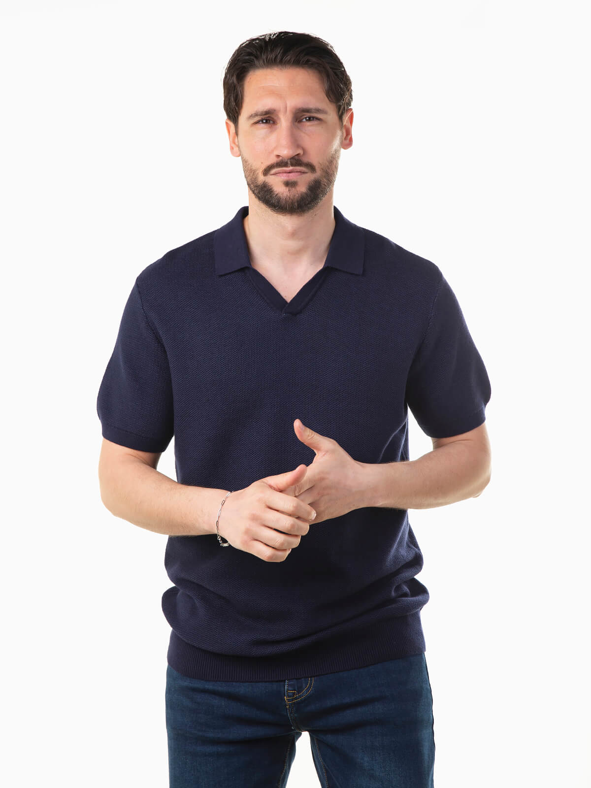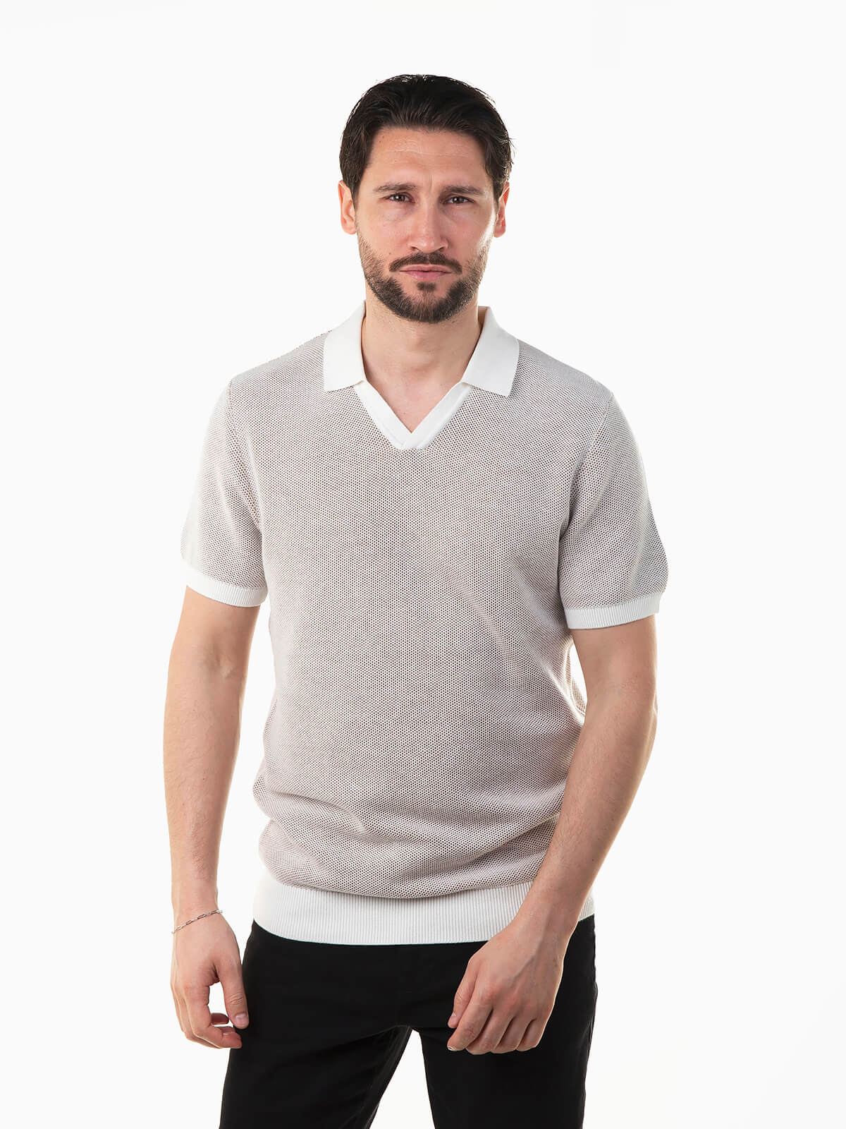 Polo em tecido de algodão com estrutura para homem. Polo manga curta com extremidades em contraste. Gola abas com acabamento em V.