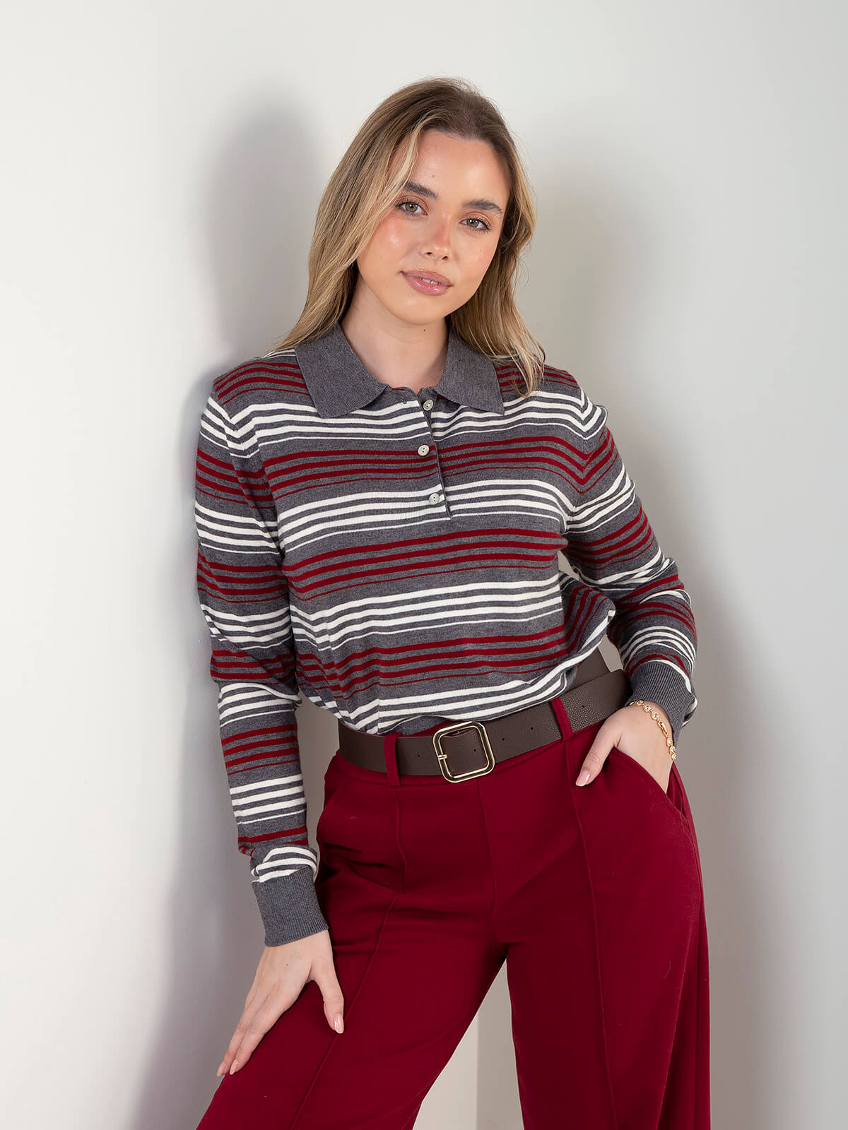 Polo de malha confortável com riscas e gola clássica com botões. Um modelo prático e intemporal, ideal para looks do dia a dia com um toque cuidado.